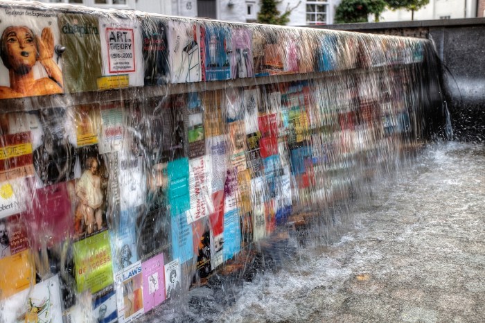Daarna loop ik het centrum in en vind ik een muur aan een soort vijver met allerlei aanplakzaken erop. Het is een leuk object om er wat opname’s van te maken. Net als ik denk klaar te zijn, wordt de pomp in de vijver aangezet en stroomt het water over de rand. Nog leuker om foto’s van te maken.