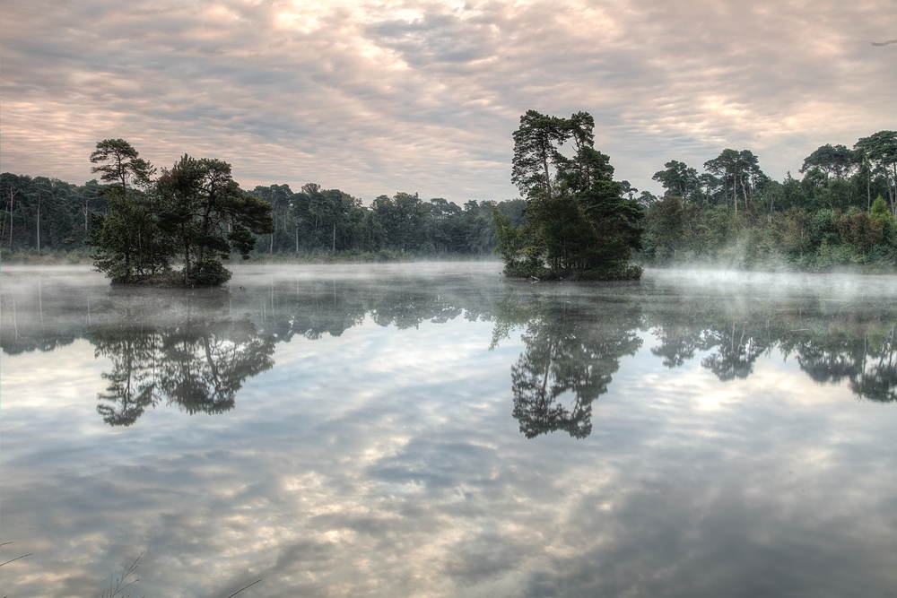 De volgende ochtend sta ik voor dag en dauw op en hoop op een mooie zonsopkomst boven het ven. Mijn geluk kan ik niet op als ik zie dat er een mooie neveldeken over het water ligt, nog mooier wordt het door de zonsopkomst kleuren. Helaas werkt een lange sluitertijd in combinatie met de zelfontspanner van de camera niet en zijn de meeste foto’s onscherp?! Gelukkig kom ik er achter voordat ik weer naar het hotel loop en maak van de laatste ochtendnevel foto’s zonder de zelfontspanner. Balen natuurlijk, maar ik heb wel kunnen genieten en weer wat bijgeleerd.