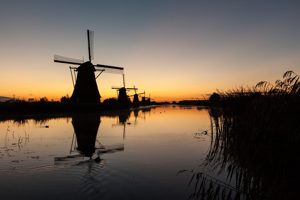Hopende op een mooie ochtendnevel en enthousiast geworden om molens in het landschap te fotograferen, vanmorgen vroeg naar Kinderdijk gereden. Ondanks dat daar voor, tijdens en na de zonsopkomst geen ochtend nevel was, was het wel wonderschoon.
