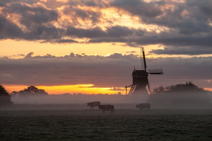 Na Kinderdijk gereden naar Groot Ammers waar een aantal molens langs een kanaal staan. Onderweg troffen we nog wel een Wipmolen aan met de voeten in een neveldeken. Samen met de koeien was het Hollands beeld helemaal compleet.