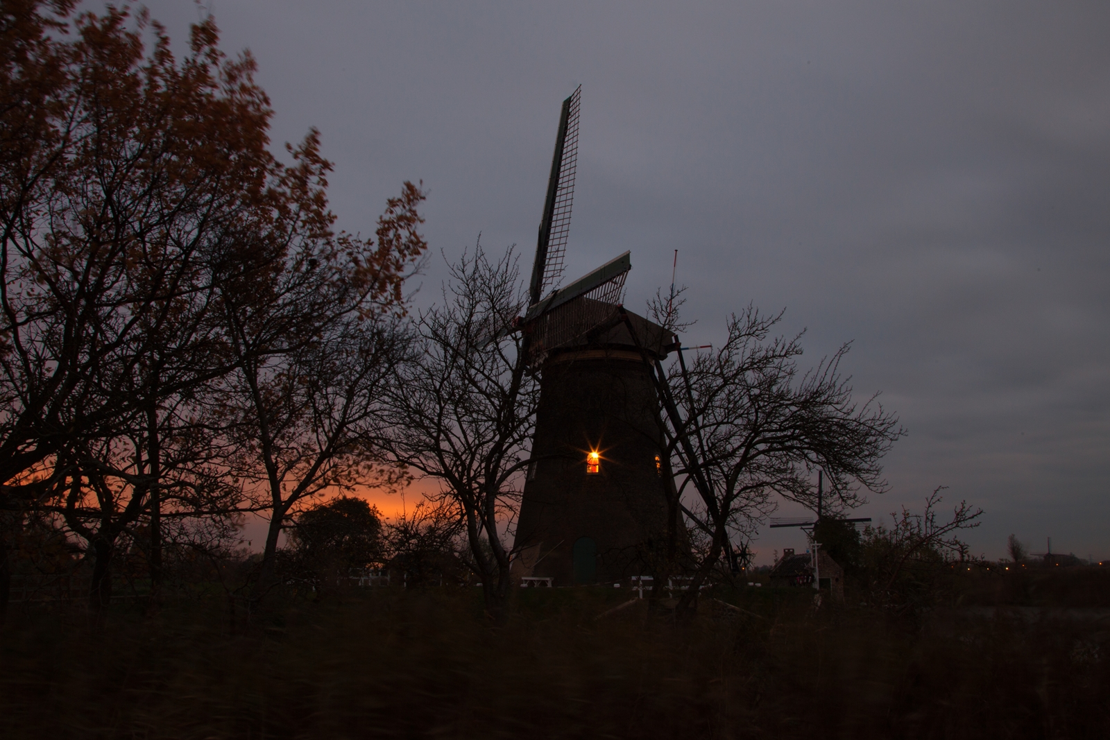 De molens van Kinderdijk, deze plek blijft me trekken en zeker vroeg in de ochtend. Het is een eindje rijden, maar als je geluk hebt en dat heb ik tot nu toe, dan kun je mooie beelden vastleggen. Dit keer heb ik gekozen voor een foto van een van de molens waar binnen het licht brandt. Op de achtergrond is niet de zonsopkomst te zien, maar de gloed van de verlichting in kassen.