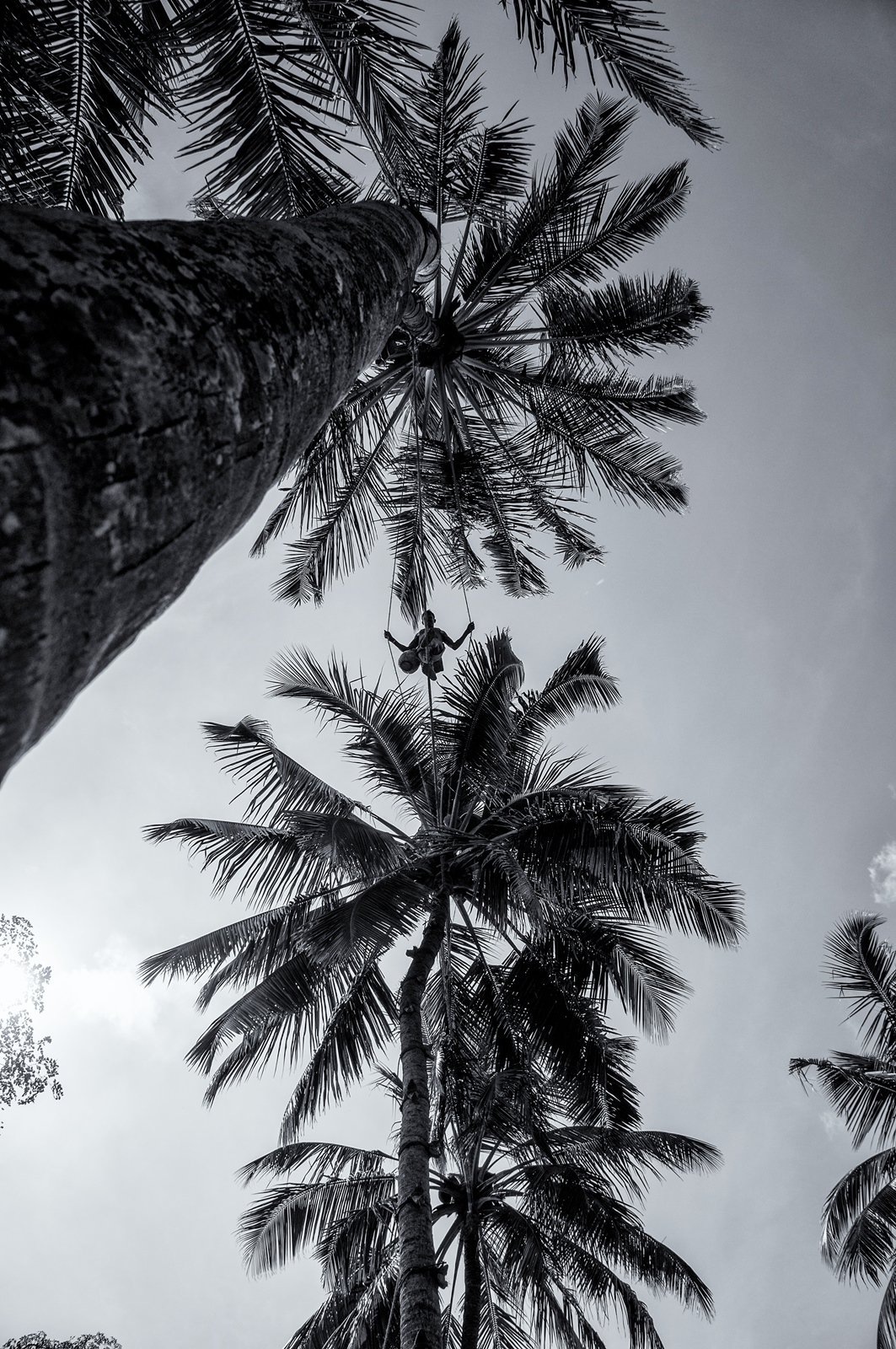 In Sri Lanka ‘wemelt’ het van de kokosnoot palmen. Van het sap van de bloem van de King Coconut wordt Arrack vervaardigd, een populair gedestilleerd drankje. Het sap, de toddy, wordt door Toddy tappers hoog in de palmbomen getapt. Een karwei dat niet geheel zonder risico verloopt. Alleen al het klimmen in een kokospalm vergt niet alleen behendigheid, maar vooral ook moed. Om het op- en neer klimmen in de verschillende palmen, spant men touwen tussen de toppen van de palmen. Daarover loopt de toddy tapper van top naar top. Helaas gebeurd het regelmatig dat een tapper uit de boom valt, met alle nare gevolgen van dien. Een van de oorzaken is dat kraaien en eekhoorns aan de touwen knagen, waardoor het kan breken zodra de tapper erop stapt.