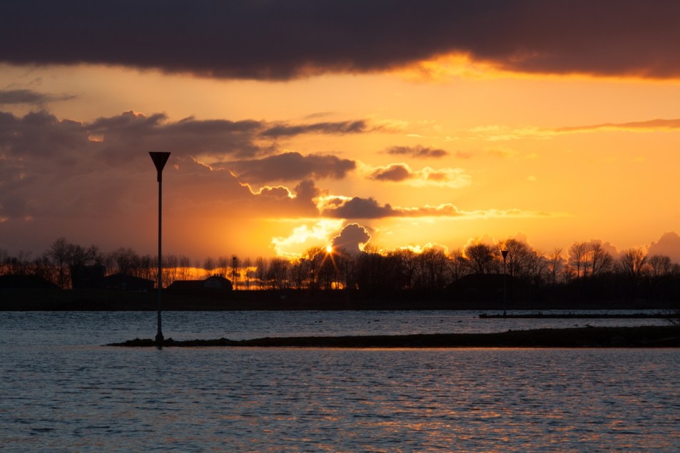 Uit het werk, voor het avondeten nog even snel naar de Lek en hopen op een mooie zonsondergang. Vanavond lukte dat uiteindelijk. Uiteindelijk, want ik was al bijtijds aan de Lek om het moment niet te missen. Maar…….niet lang voordat de zon onder zou gaan, schoof er een enorme bui voor de zon. Op het moment dat ik mijn apparatuur bijna had ingepakt, zag ik dat het er toch op leek dat de donkere wolkenpartij een gaatje voor de zon zou maken. Daarom snel weer mijn spullen gepakt en naar een van de strekdammen gelopen waar ik precies op tijd kwam om de zonsondergang vast te kunnen leggen. De gouden gloed die dit teweeg bracht, duurde slechts enkele minuten, maar….de foto’s die ik wilde maken had ik gemaakt!