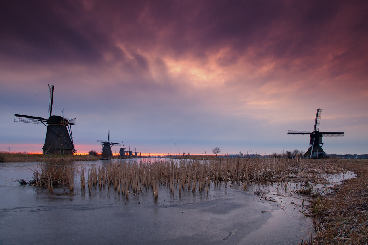 Als ik onderweg ben, verschijnt er een smalle band in de blauwe ochtend schemer die oranje rood kleurt. Dat belooft wat! Bij de molens aangekomen schiet ik een serie foto’s. Het riet is gemaaid en zo kan ik een mooi laag standpunt innemen. De zon komt precies achter de eerste molen in een rij van vijf, tevoorschijn. Het is echter niet meer dan een glimp. Na een paar tellen wordt het zicht aan de zon onttrokken door de wolken. Even hoop ik alsnog op een mooi kleurenspektakel, maar helaas. Toch ben ik tevreden en rijd met een goed gevoel weer terug richting huis en daarna naar Schiphol.