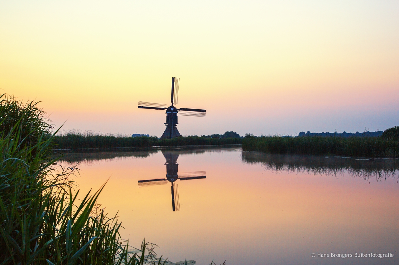 Een van mijn favoriete molenplekken is de Broekmolen vlakbij Streefkerk en toevallig komt daar in de periode de zon precies achter de molen op, staande op de brug en langs de oever van de Achterwaterschap. Er is evenwel geen aanleiding voor ochtendnevel, maar wel een mooie zonsopkomst. Redenen genoeg om naar deze molen te rijden. En, ik heb geluk; het golden hour is schitterend en de zon is mooi zichtbaar en ook goed fotograferen. Tevreden keer ik na het schouwspel terug naar huis en bewerk een van de foto’s met het pre-filterset van NIK software, waardoor de kleuren door de Golden Hour nog intenser worden.