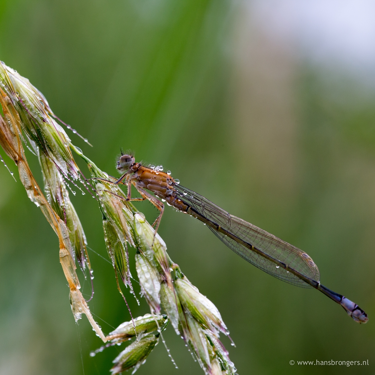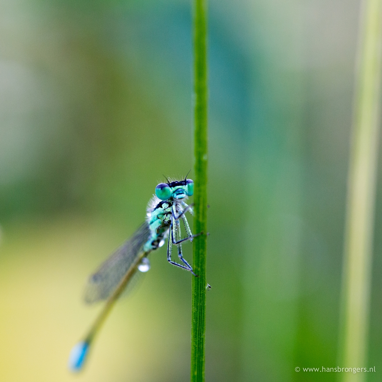 De kunst van het fotograferen van onder andere libellen of juffers is het vinden van de juiste scherptediepte. Je wilt tenslotte op de foto dat de nadruk ligt op het onderwerp en moet de achtergrond geheel ondergeschikt daaraan zijn. Daarbij wil je natuurlijk ook dat de hele libel of juffer scherp is en al die wensen bij elkaar brengen, is een echte uitdaging. Er zullen vast ezelsbruggetjes en/of rekentabellen zijn om de juiste diafragma, bij de juiste sluitertijd te vinden. Maar….ik probeer ‘gewoon’ uit, als het beestje me daartoe de gelegenheid geeft natuurlijk. Al fotograferend verander ik het diafragma van het laagste getal, stap voor stap naar een hoger diafragma. Belangrijk daarbij is het om rekening te houden met de sluitertijd, die naar mate het diafragma groter wordt ook langer wordt. De kans op bewegingsonscherpte neemt daarbij toe. Door echter de ISO waarde te verhogen, verhoog je automatisch ook de sluitertijd, maar ook de kans op ruis…..Tja, er komt wel het een en ander bij kijken voordat je de voor jou en op dat moment ideale foto hebt van een libel of juffer.