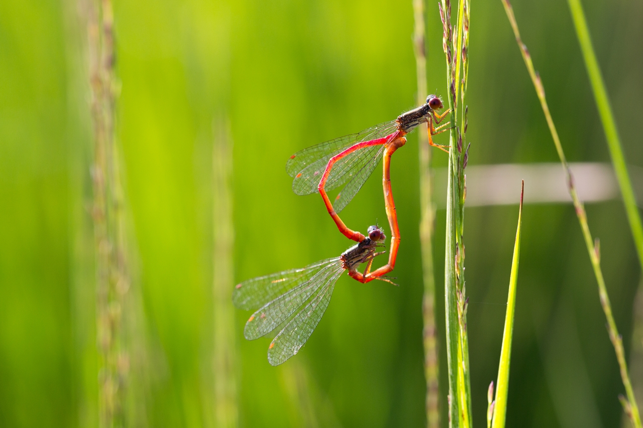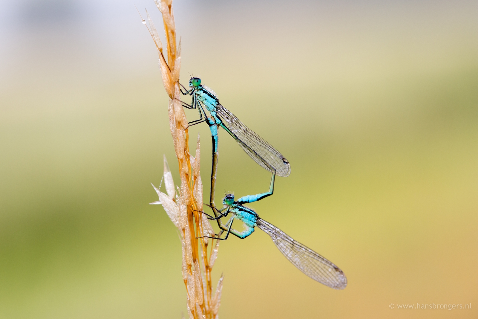 In dit geval heb ik de Auto Focus (AF) ingeschakeld, het AF punt op spotmeting gezet en de instelling AI servo gekozen. Hierbij heb ik scherp gesteld op het lijf van van een van de juffers. In de AI servo volgt het toestel het punt waarop je hebt scherp gesteld en is dus goed te gebruiken bij alles wat beweegt. Het is wel de kunst om precies op het onderwerp te blijven richten, zeker als je hebt gekozen voor de spotmeting. Je hoeft hierbij maar een fractie naast je object te zitten en de AF zoekt een ander scherpstelpunt op! Daarbij heb ik voor een niet al te hoog diafragma getal gekozen, in de hoop dat beide juffers scherp eruit zouden komen. Volgens mij is dit aardig gelukt bij zowel het stel lantaartjes (bovenste foto) en het stel koraaljuffers (onderste foto).