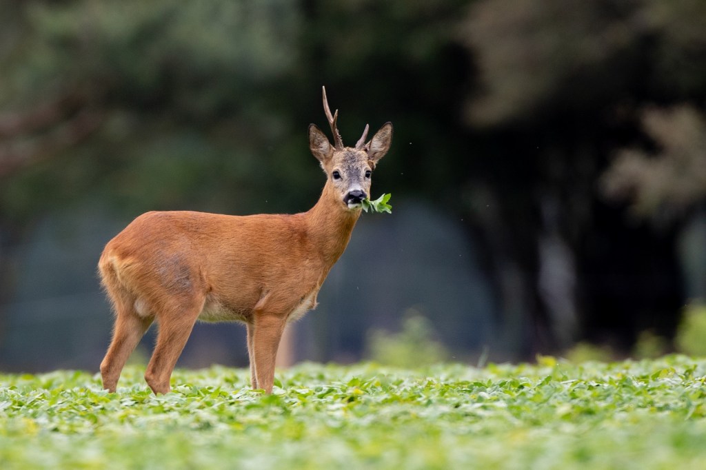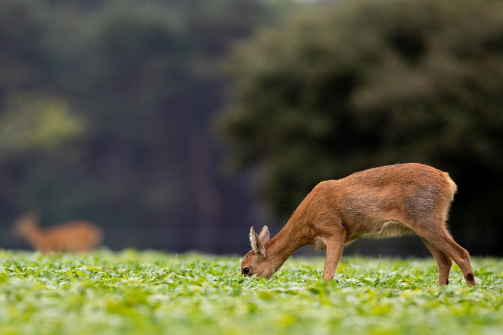 Als wij weer terugkomen bij het boekweit veldje staan er warempel 3 reeën. Zij doen zich, zonder zich al te veel aan te trekken van onze aanwezigheid, tegoed aan de jonge boekweit plantjes. De reebok – afbeelding hieronder – heeft 1 gezond en 1 misvormd gewei.
