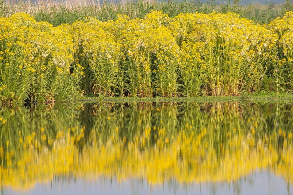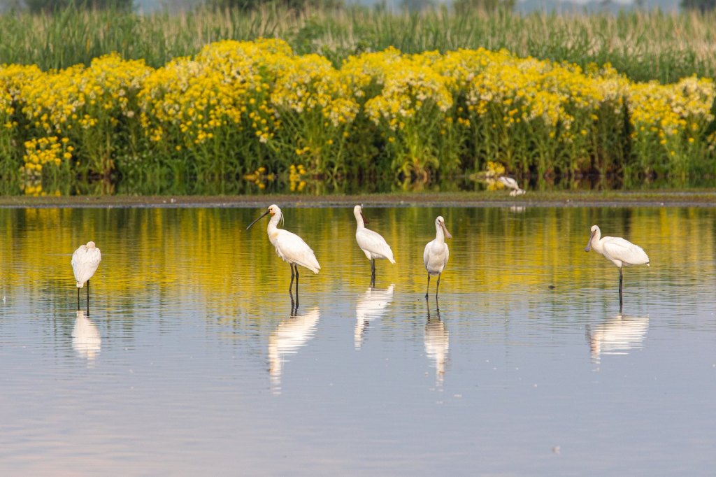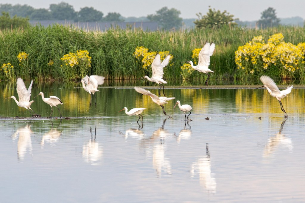 Lepelaars. Het is bekend dat de lepelaar de Waverhoek graag bezoekt. Al snel na het verlaten van de parkeerplaats, kun je de lepelaars vanaf het pad op de grote plas zien. Ik zie er een stuk of 15 waarvan veel jongen die aanhoudend bedelen. Bijna irritant lijkt dit gedrag, dat vaak door de ouders geheel wordt geneert. Om foto’s te maken moet ik door het riet fotograferen en dat levert niet echt mooie beelden op. Even verderop heb ik de groep lepelaars vol in beeld. Het water waar zij staan is rimpelloos en zorgt voor een mooie weerspiegeling. Het bloeiende waterkruiskruid langs de oever zorgt voor een fraaie gele achtergrond.