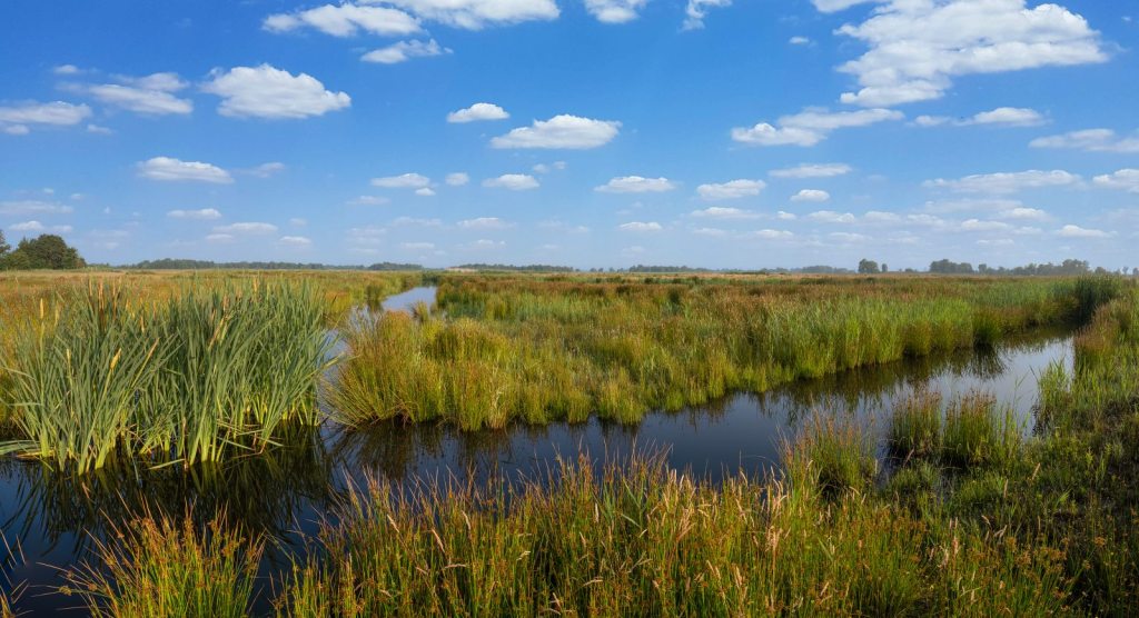 Na een tijdje kom ik via opnieuw een bruggetje, in een open veengebied met deels zichtbaar water, maar vooral heel veel onzichtbaar water. Geen gebied dus om er eens lekker doorheen te struinen. Hier hoop ik veel libellen en vlinders te zien, maar helaas laten deze fladderaars het afweten deze ochtend. Wel hoor ik vooral veel vogels, met nadruk op ‘hoor’, want ook deze blijven nu kennelijk liever buiten beeld. Gelukkig is het landschap interessant genoeg om een aantal foto’s te maken. Om een indruk te geven van de weidsheid maak ik een aantal opnames in de portretstand. Deze laat ik mijn pc thuis samenvoegen tot een panorama opname.