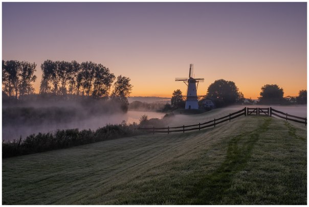 Wanneer er voor de volgende ochtend nevel wordt voorspeld en de zon mooi opkomt achter een van mijn favoriet molens, dan is de keuze snel gemaakt. Vroeg op of beter gezegd; héél vroeg op. Geen punt! Ook twee maatjes van ons fotoclubje ‘Natuurlijk’ willen die kans niet voorbij laten gaan. De molen die ik met hen vanmorgen bezoek is de Vlinder langs de Linge bij Enspijk. Normaal gesproken ben ik de enige fotograaf, vandaag ben ik niet zeker. En dat gevoel klopt, twee anderen zijn ons voor.