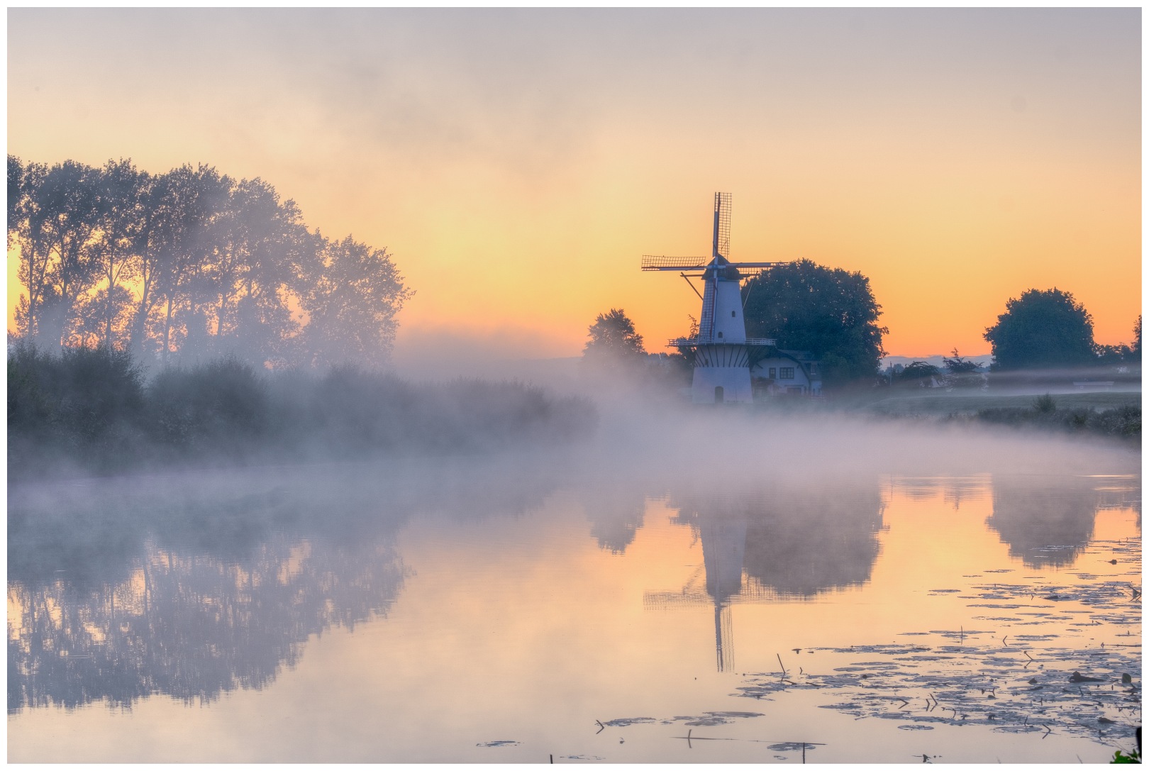 Het blauwe uurtje gaat geleidelijk over in het gouden uurtje, waarbij de opkomende zon steeds meer kleur brengt. De zon komt op een prachtige plek op en wel aan de overkant van het water, in mijn compositie tegenover de molen. Het is geheel onbewolkt en normaal gesproken is het met fotograferen snel gedaan als de zon net over de horizon kijkt. Vanmorgen zorgt echter de nevel voor een aangename filter. De nevel zorgt er voor dat het zonlicht getemperd wordt, waardoor het felle zonlicht niet direct leidt tot een uitgebeten vlek in de opname. Helaas duurt de strijd tussen de zon en de nevel kort en komt de zon als gebruikelijk als winnaar uit de bus. Daarmee is het voor ons als fotografen gedaan en kunnen de schapen met een gerust hart gaan grazen.