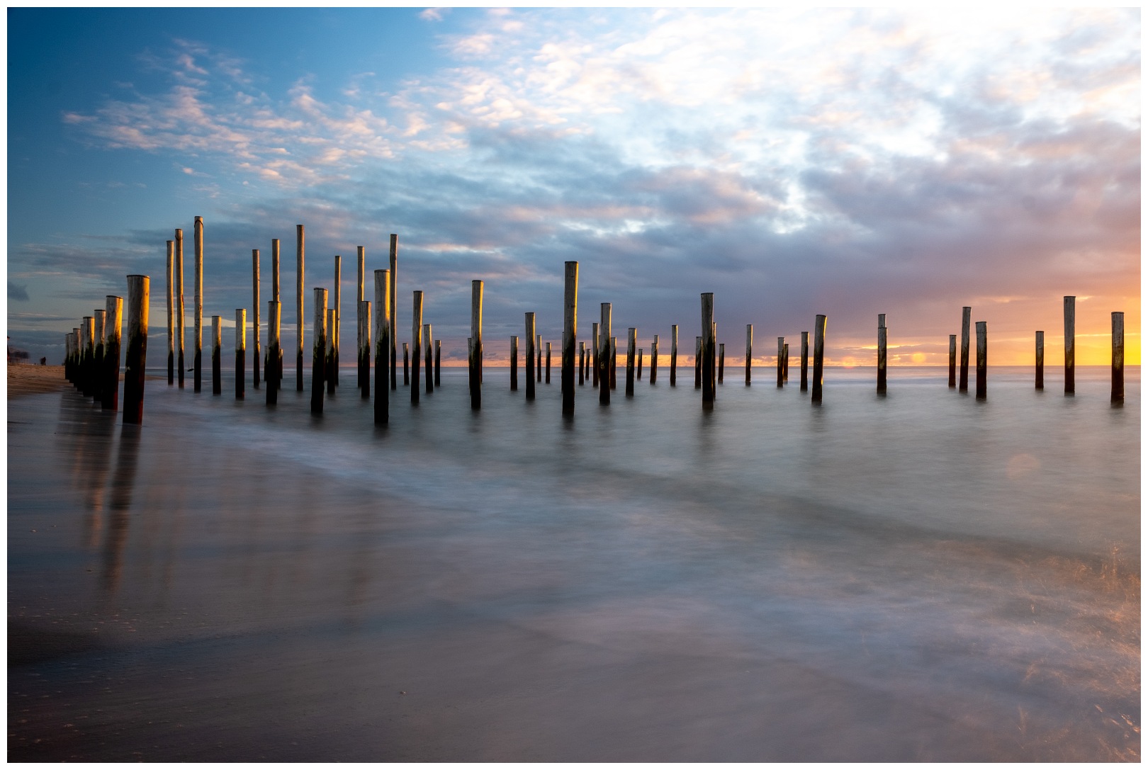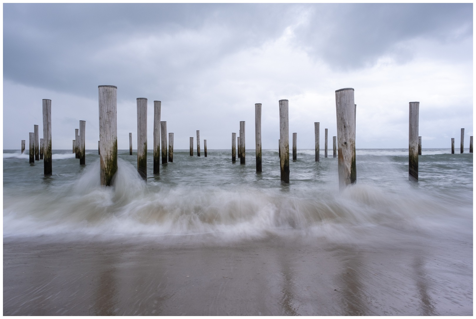 Op een zeker moment viel mijn oog op foto’s van de palen aan het strand van Petten. Als liefhebber van minimalisme en van lange sluitertijd opnames, een prachtige locatie om eens te bezoeken. Volgens de getijde-tabel en het tijdstip van zonsondergang was 1 september ’20 daarvoor een mooie dag. Samen met drie foto cameraden stond ik op die bewuste namiddag op het strand van Petten oog in oog met 160 houten palen. De houten palen van zes tot twaalf meter zijn daar geplaatst in de vorm van tien huizen en een kerk. Het vormt daarmee een monument ter herinnering aan het oude Petten, wat lang geleden werd overspoeld door de zee.