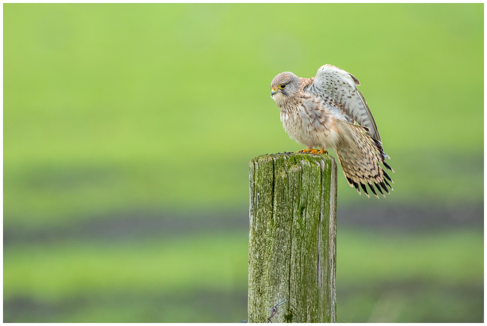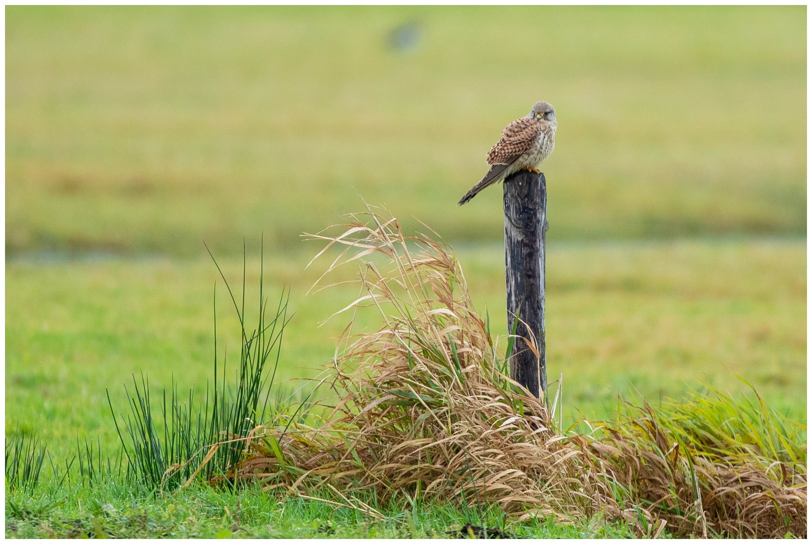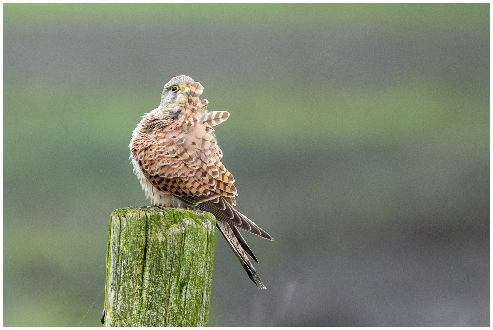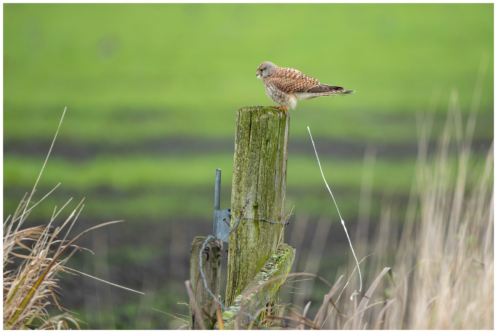 Na een koffiepauze besluiten wij naar een ander deel van de Arkemheenpolder te rijden. Daar hebben wij geluk. Een torenvalk zit op een ijzeren hek en is goed benaderbaar. Van een tegemoetkomende auto moet het blijkbaar niets hebben en vliegt weg. Gelukkig vindt het een houten paal in het weiland ongeveer 50 meter van ons verwijderd. Een mooie afstand èn …. het levert een mooi totaal beeld: de valk in zijn habitat. Mooier kan het voor mij bijna niet. Tuurlijk is een shot van dichtbij ook erg mooi, omdat dan alle details en kleuren van de vogel goed in beeld komen.