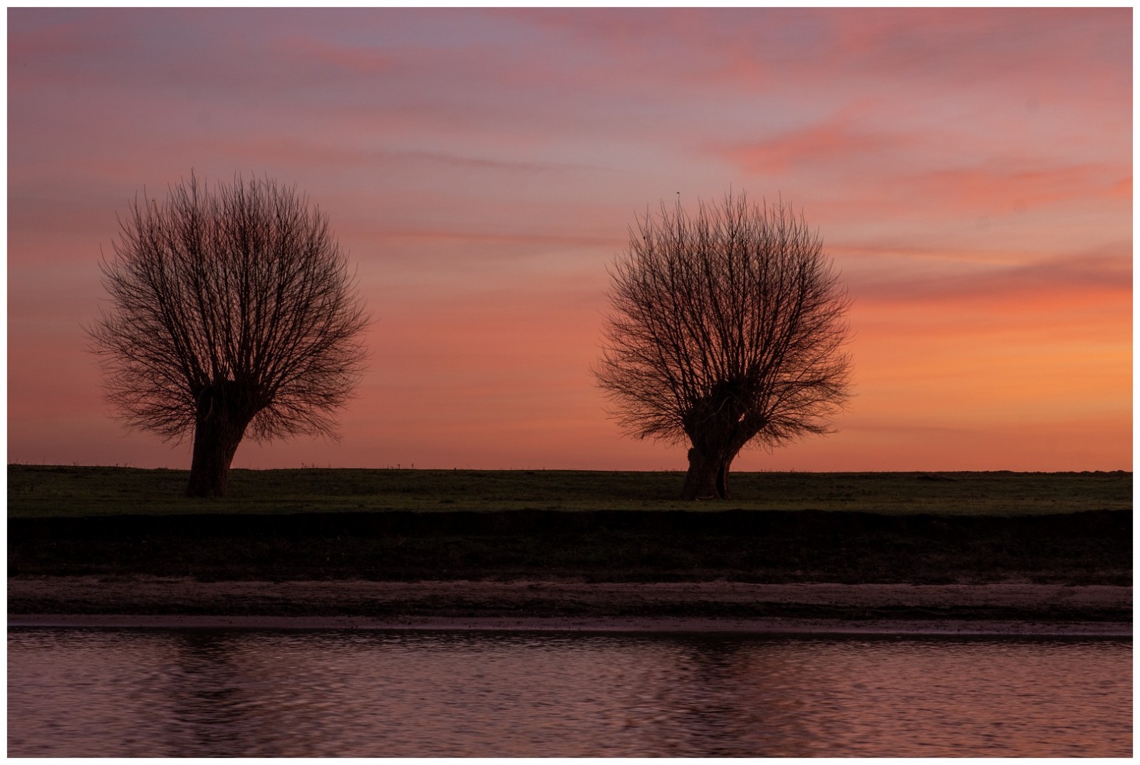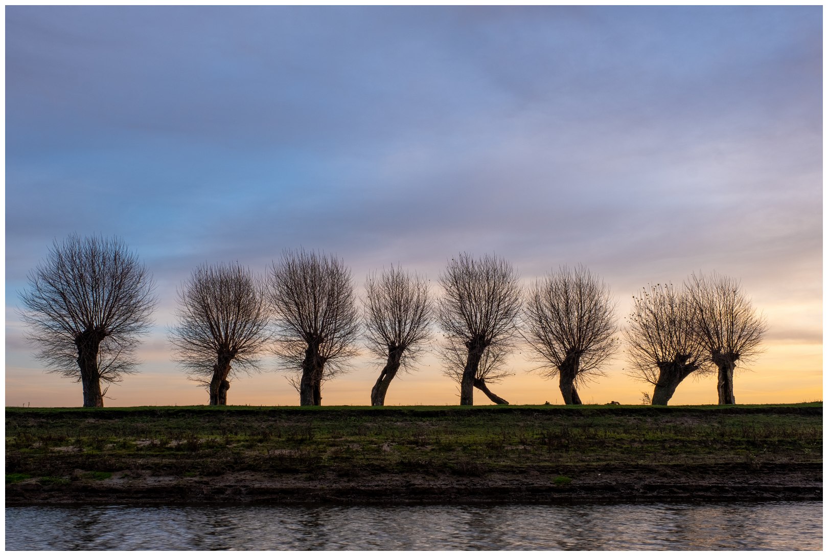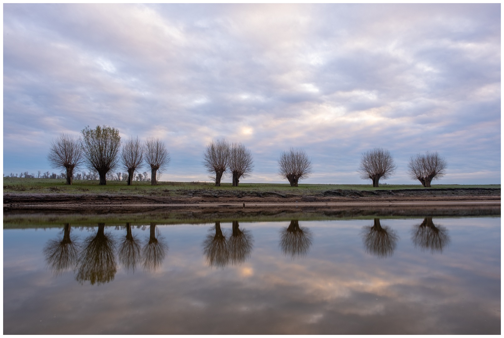 Bij de herinrichting van de uiterwaarden heeft men bewust de oude knotwilgen gespaard. En…zij staan op een geweldig mooie plek direct langs de oever van de nevengeul. Keurig in een rij en waarschijnlijk al vele jaren lang. Hoe mooi is het dat men deze oude knarren heeft laten staan! De bomen zijn op zich al fotogeniek, maar laten zich bij windstilte ook mooi weerspiegelen in het water van de nevengeul.