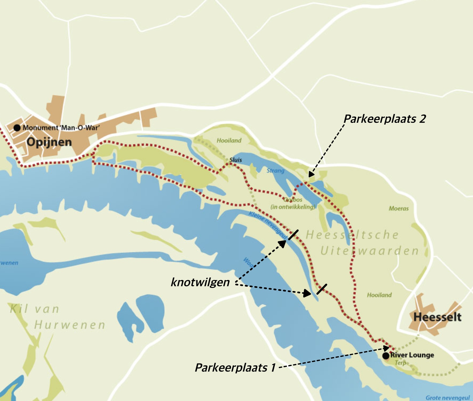 Er zijn twee parkeermogelijkheden om vandaar naar de knotwilgen in de Heesseltsche Uiterwaarden te lopen – zie onderstaande afbeelding. De parkeerplaats (2) tegenover het dorp Heesselt is ruim en gemakkelijk bereikbaar. Verlaat hiervoor de dijk bij het monument van ‘De Koe’ (is niet te missen) naar Theetuin River lounge. De andere parkeerplaats vind je langs de Waalbanddijk tussen de dorpen Opijnen en Heesselt. Deze parkeerplaats ligt onderaan de dijk na een stijl en smal toegangspad. Het beste is deze afdaling te benaderen vanaf de Esterweg. Vanaf deze weg rijd je namelijk de dijk af in de rijrichting. Anders moet je een enorm scherpe bocht maken! Parkeerplaats 1 heeft mijn persoonlijke voorkeur. Behalve dat het hier vandaan niet zo ver naar de knotwilgen lopen is, ben je ook snel aan de overkant van de Grote nevengeul. De plek waar bij windstilte de knotwilgen zich mooi laten weerspiegelen in het water.