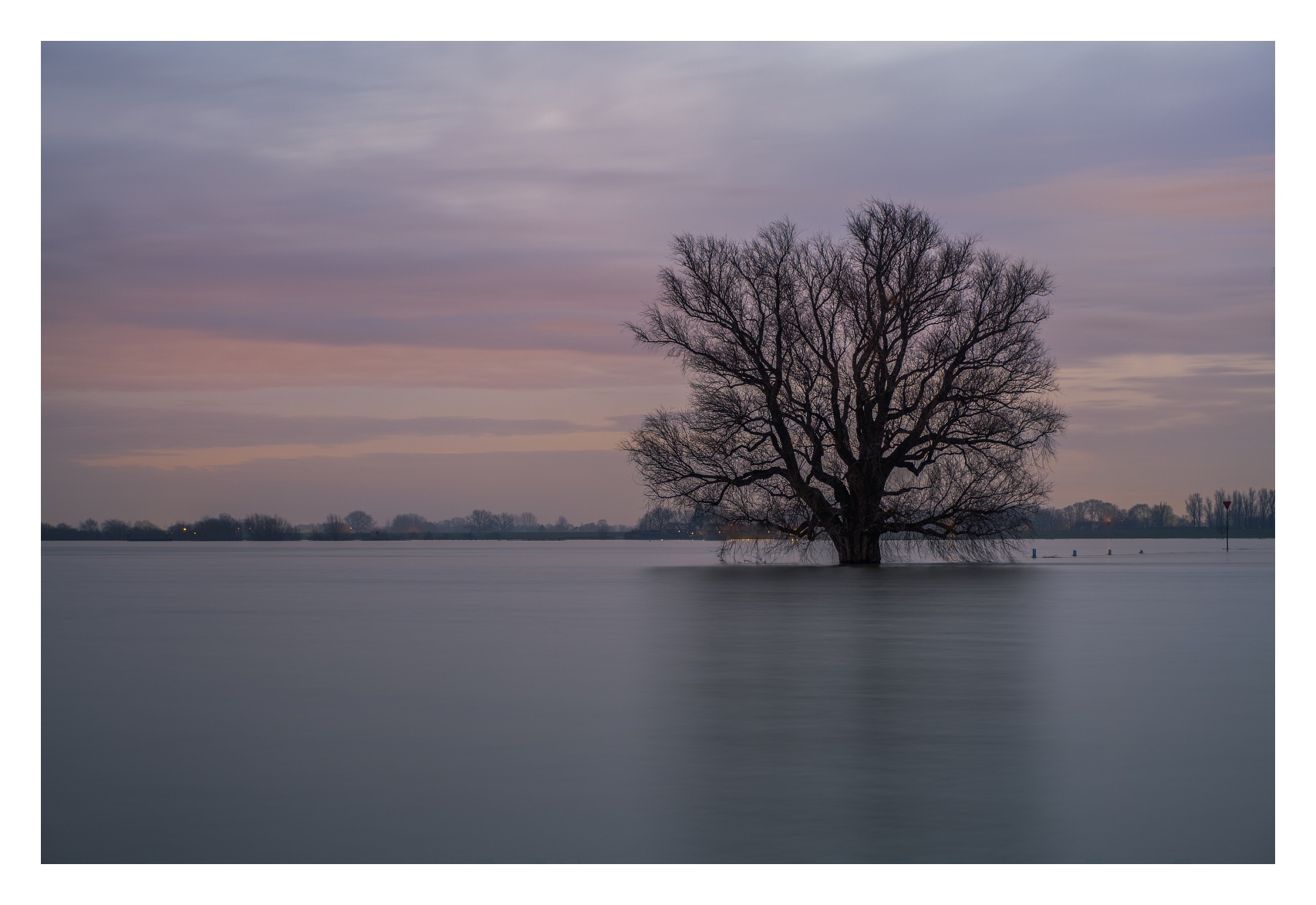 Op maandag de 10e januari ontmoette ik mijn twee foto kameraden op de afgesproken plaats en op het afgesproken tijdstip. De afgesproken plaats was Varik langs de Waal en het tijdstip kort voor aanvang van het blauwe uurtje. Lekker vroeg dus. Voor Varik kozen wij vanwege de enorme eik die enkele tientallen meters van de dijk af op een parkeerplaats staat. Doordat bij extreem hoog water deze eik wordt omringt door water lijkt het dat deze reus midden in de rivier staat. Tegelijkertijd is het een mooi ijkpunt voor de opname.