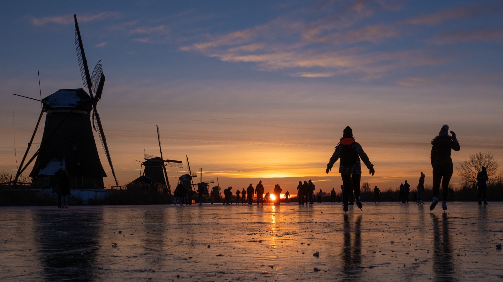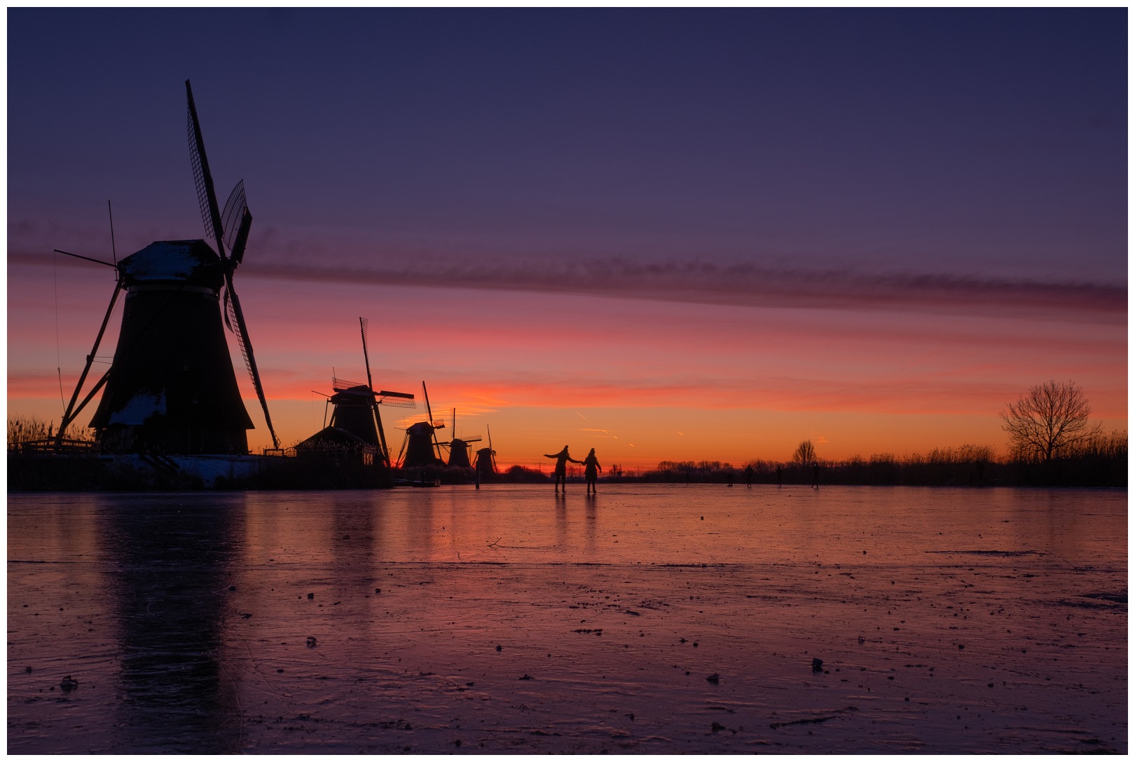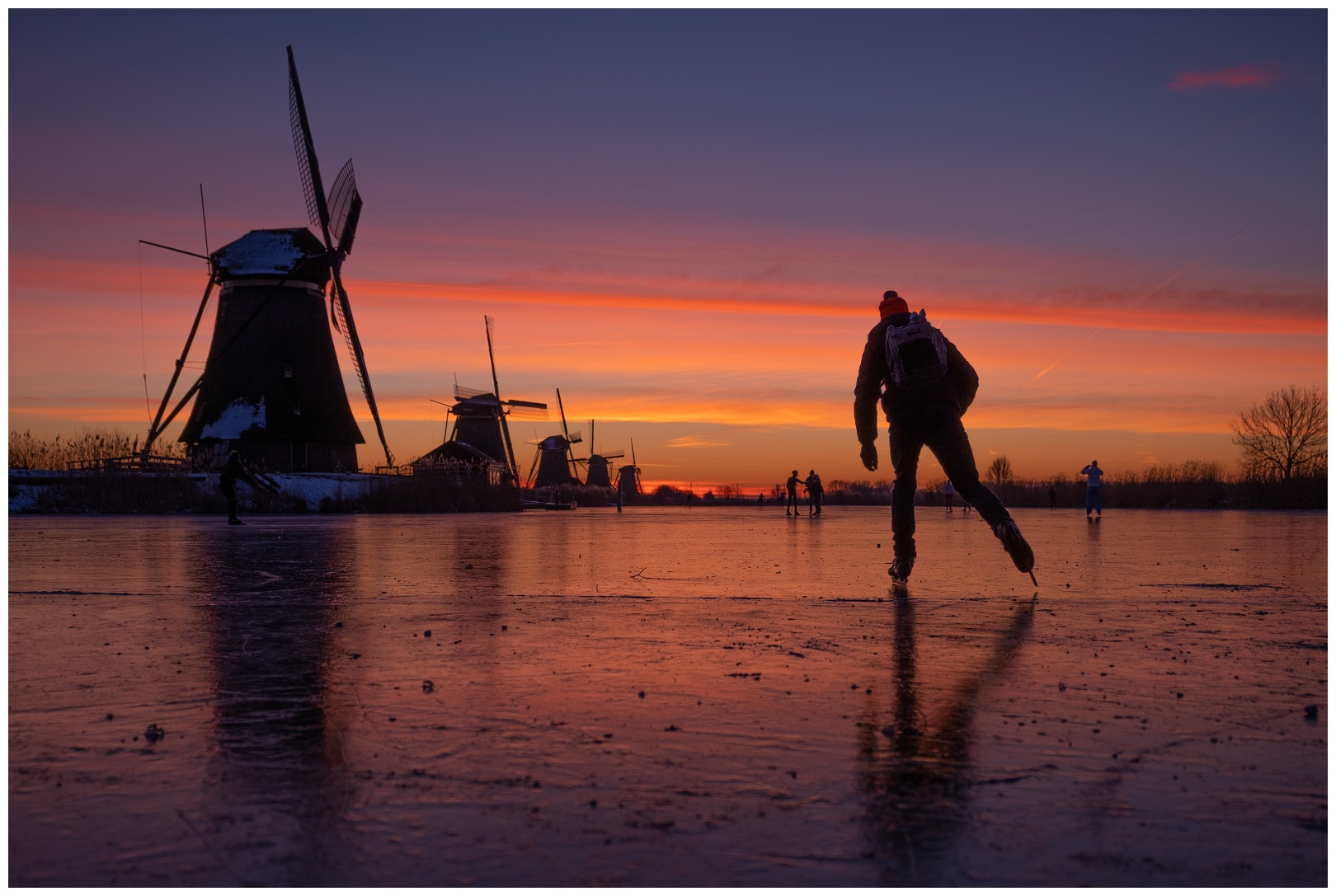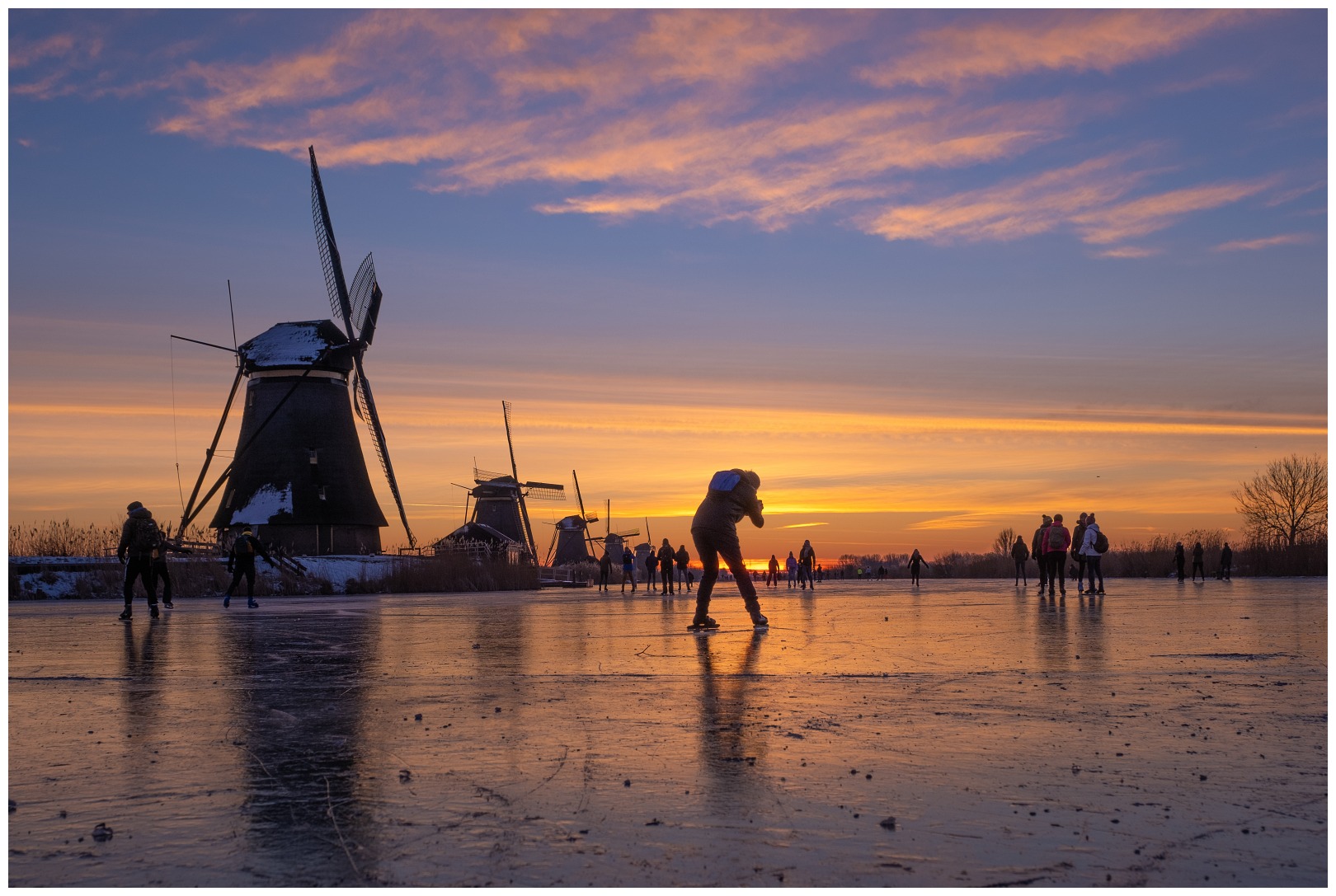 Op de late avond van de 13e februari zie ik op tv beelden ‘voorbij’ komen van schaatsers bij de molens van Kinderdijk. De weervoorspellers geven tevens aan dat dit waarschijnlijk de laatste dag is dat er op open water geschaatst kan worden. De beelden en de voorspelling van het naderende einde van de schaatspret laten mij geen moment twijfelen: Morgenochtend ga ik dáár naartoe!
