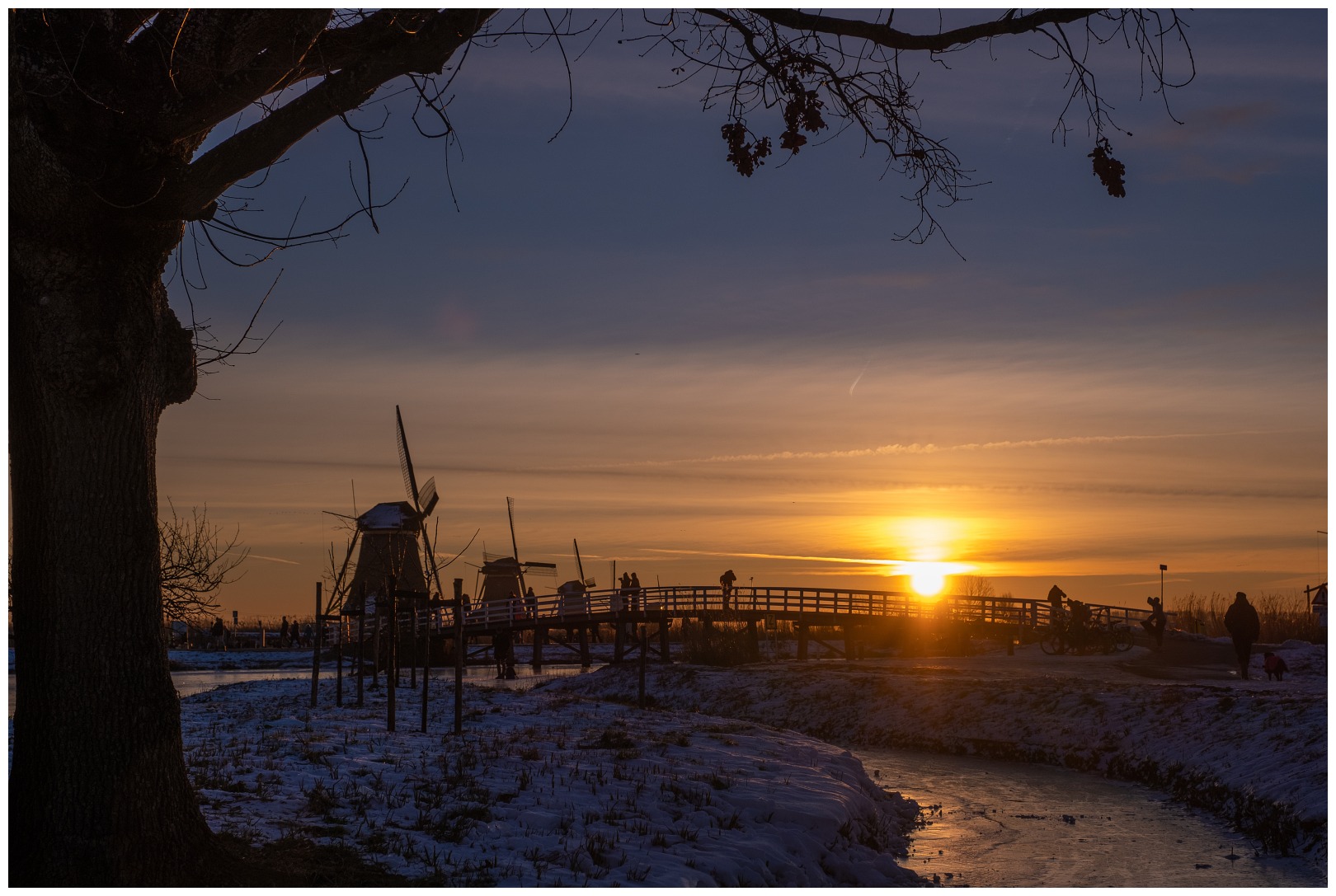 Nadat de zon is opgekomen vind ik het welletjes en wandel terug naar mijn auto. Onderweg geniet ik nog van de molens in een winterse omgeving. De auto staat er nog en er zit geen bonnetje tussen mijn ruitenwisserblad. Met een goed gevoel rijd ik naar huis….