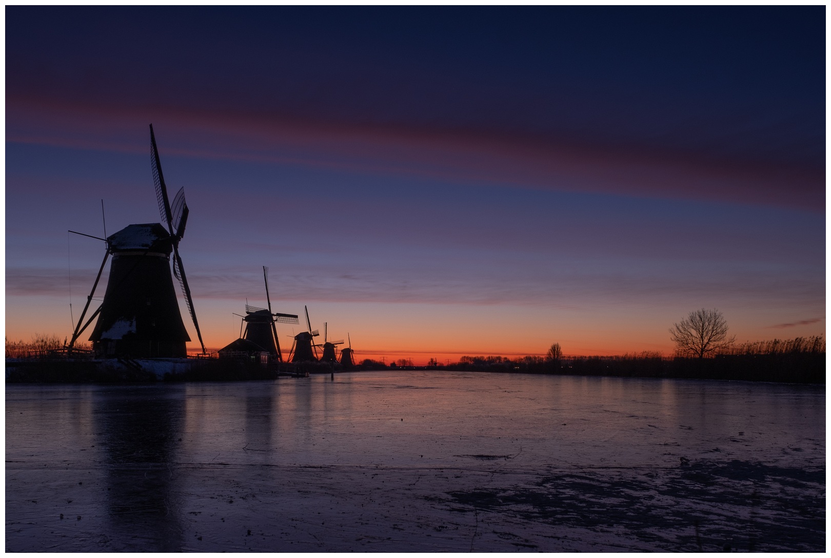 In het donker loop in een goed kwartier ik naar de plek die uiterst populair is bij de fotografen. Het is een plek waarbij je een vaart inkijkt met aan de linkerzijde een vijftal molens. Het toeval treft dat de zon vandaag precies door het midden van de vaart opkomt. Het is bovendien een beetje bewolkt. Of te wel; alle ingrediënten zijn vanmorgen aanwezig voor fraaie beelden.