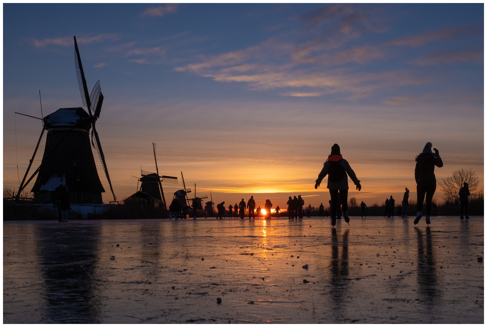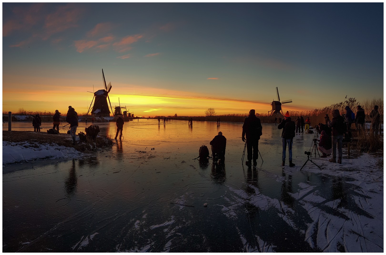 Meer en meer schaatsers verschijnen, maar ook fotografen. Iedereen wil nog een keertje genieten van de ijspret tussen de molens van Kinderdijk.