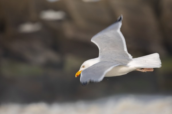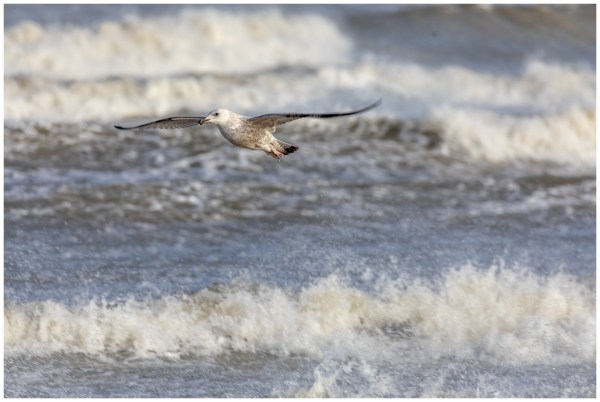 Nadat de zon op was, was er voldoende licht om te fotograferen. Door de harde windvlagen was dit een behoorlijke opgave om de camera met de 100×400 mm lens erop stil te houden. Het statief had ik bij voorbaat al in de auto gelaten, want die had nu geen enkel voordeel. Aanvankelijk probeerde ik opnames te maken van de golven waarbij de wind de toppen van de golf afblaast. Het mooiste resultaat om dit fenomeen vast te leggen is wanneer de zon in je rug staat en je tegen een donkere lucht (bui) in fotografeert. Omdat deze donkere lucht ontbrak, maakte ik gebruik van de betonblokken van het havenhoofd. Geen ideale achtergrond, maar veelal moet je het doen met de geldende omstandigheden.