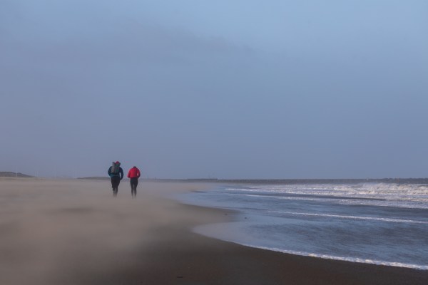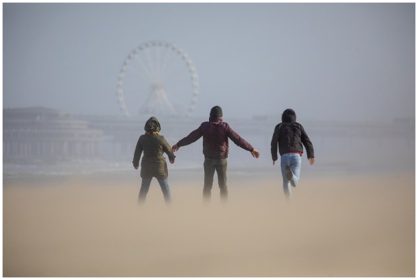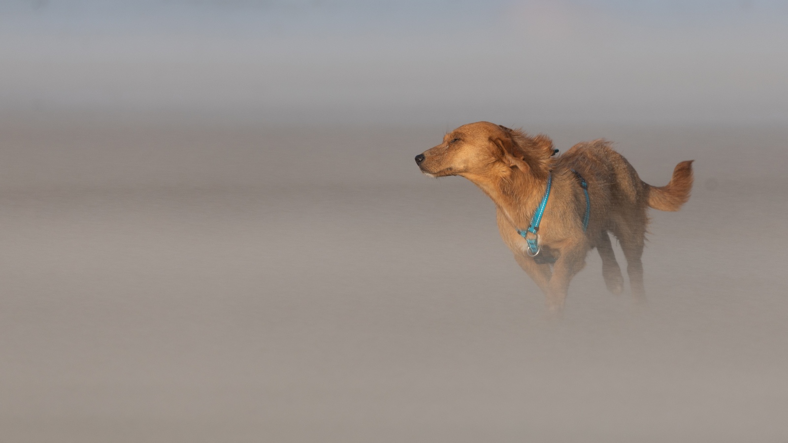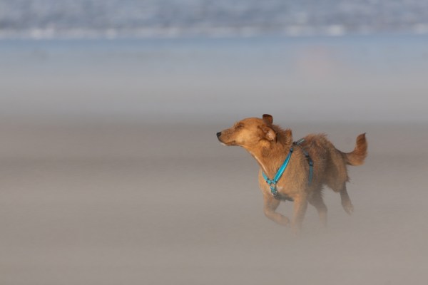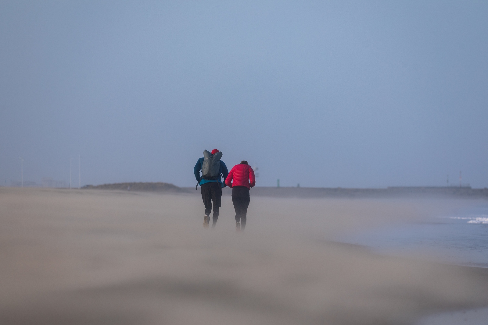 Naast de golven verschenen ook de eerste sportieve bezoekers op het strand. Om opnames te maken van de joggers en tegelijkertijd de storm te visualiseren, lag ik plat op mijn buik. Hierdoor had het voortjagende zand mij en mijn apparatuur volledig in zijn greep. Het gevolg was dat binnen een mum van tijd alles onder het zand zat, maar…ik kreeg ook wat ik voor ogen had.