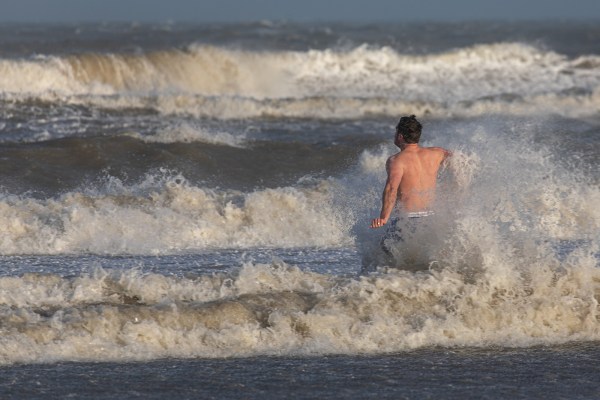 Ook dook er zelfs een enkelen in de golven. Een van die ‘liefhebbers’ had zijn hondje meegenomen en ik had met het beestje te doen. Het kwam namelijk met zijn koppie amper boven de zandstorm uit. Gelukkig duurde de duik van zijn baasje niet lang. Voor mij was het verblijf op het strand van vier uur lang genoeg, geslaagd en ging met een verwaaide Coronacoupe huiswaarts.