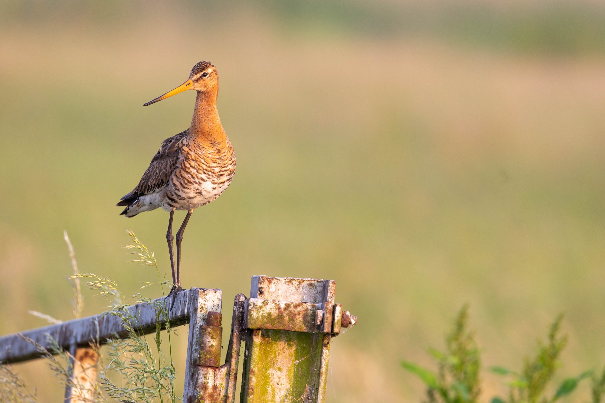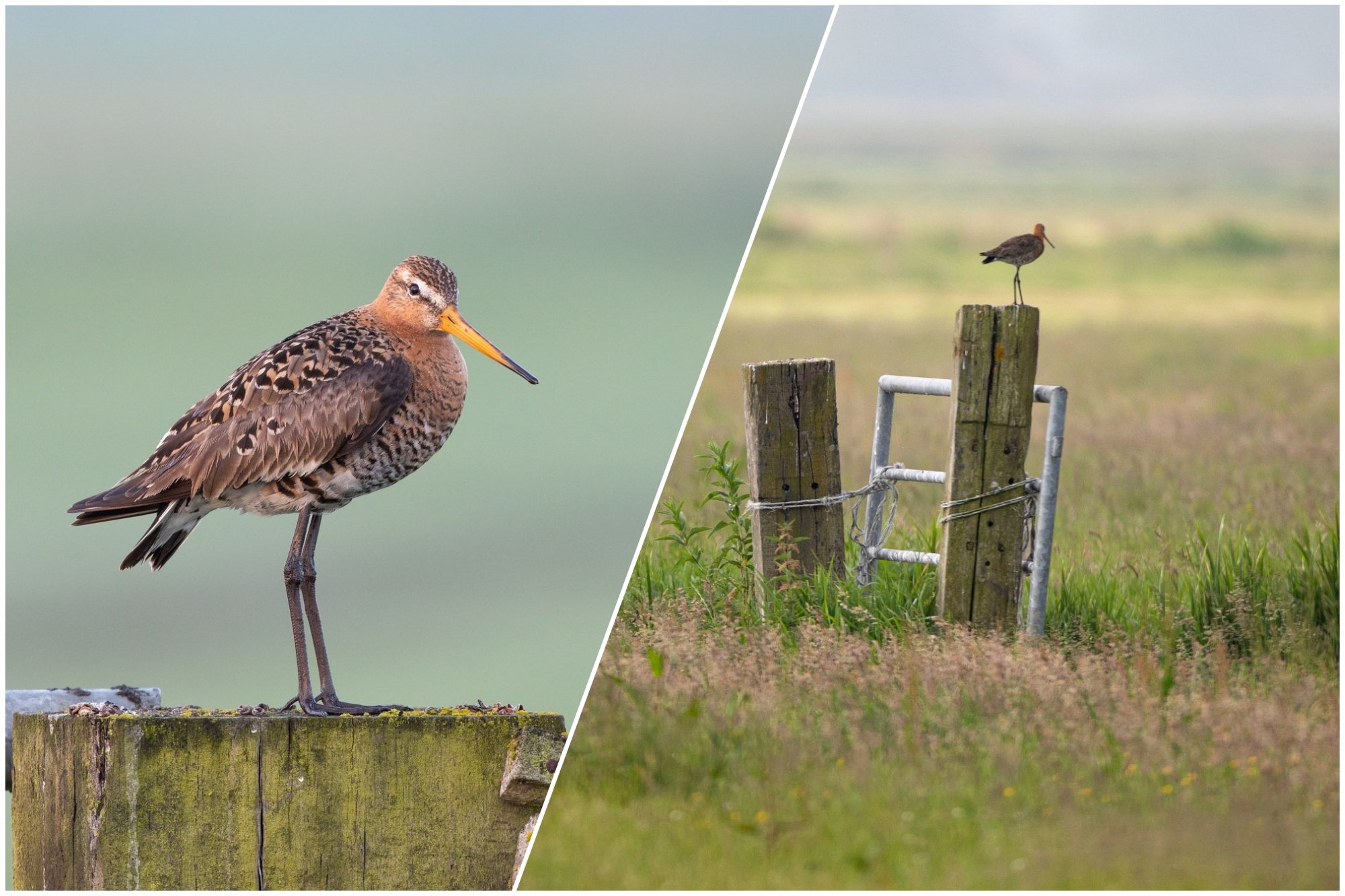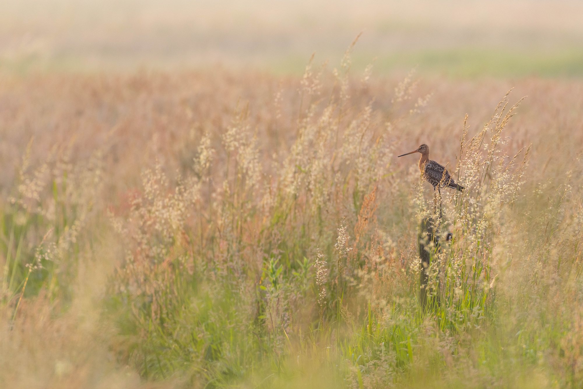 Met enige regelmaat stel ik mijzelf de vraag: “Zal ik dit nu dichtbij fotograferen of juist (wat) verder weg?” Soms ontkom ik er niet aan om een close up te maken. Zoals bij de grutto die op enkele meters van mijn mobiele vogelhut op een paal zit. Wanneer ik dan de 500 mm lens op de camera heb kan ik niet anders dan een beeldvullende opname maken van de grutto.