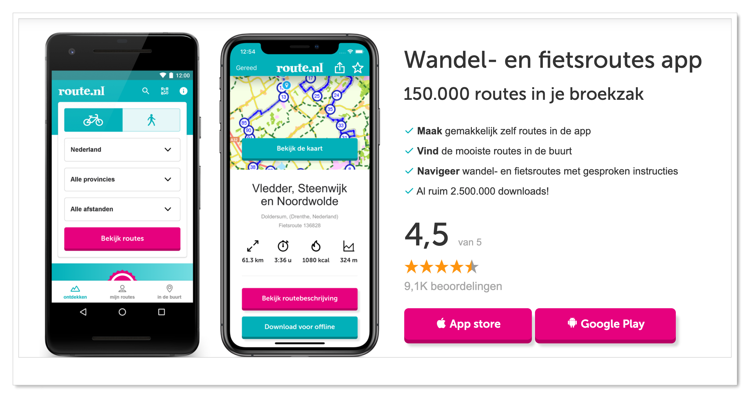 Al jaar en dag maak ik gebruik van de routeplanner van Route.nl. Een planner waarmee ik eenvoudig onze eigen wandel en fietstochten maak. Na de route uitgestippeld te hebben, scan ik deze via de app van Route.nl een QR code op mijn smartphone. Na een tweede download is de route klaar voor offline gebruik op de smartphone. Wel zo gemakkelijk en kostenbesparend want je hebt tenslotte onderweg geen internet verbinding nodig. Eenmaal op pad of op de fiets, vertelt een dames-stem waar je naartoe moet. Heel soms is zij de kluts kwijt en heel soms weet zij niet meer wat links en rechts is. Maar ja, dat heb ik ook wel eens. De route met begeleidende stem heeft ons in ieder geval nooit echt laten dwalen. Wij zijn erg tevreden met deze site en app en daarom wat ons betreft een aanrader…