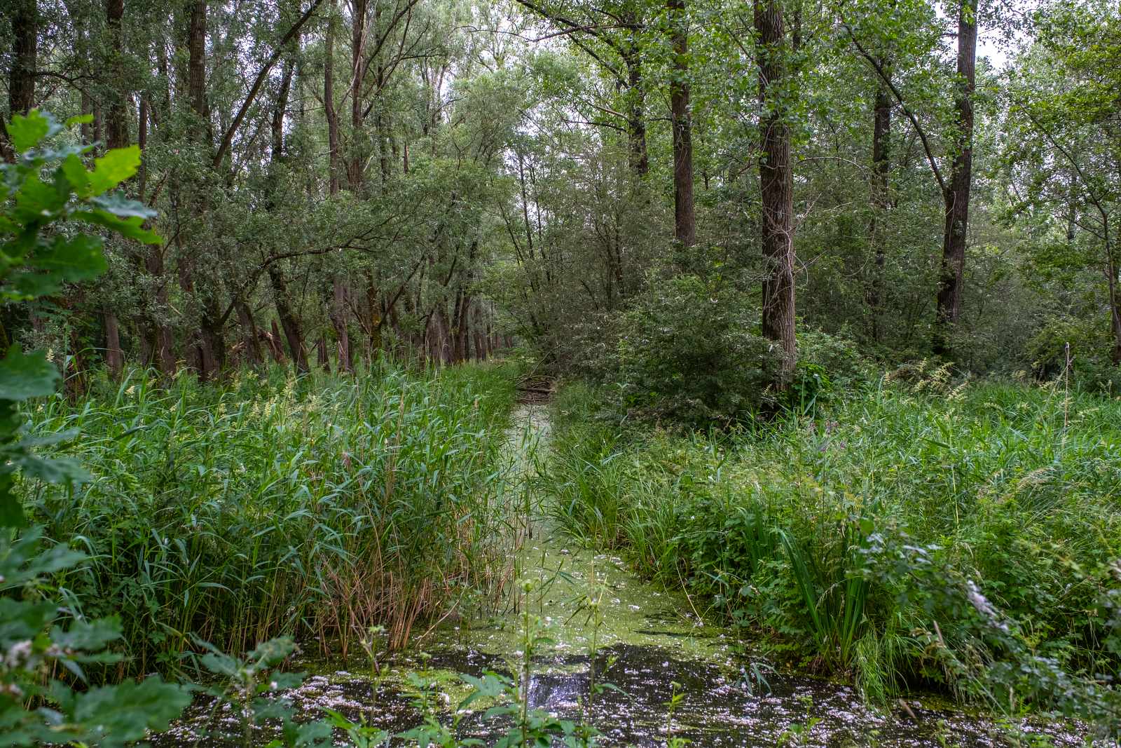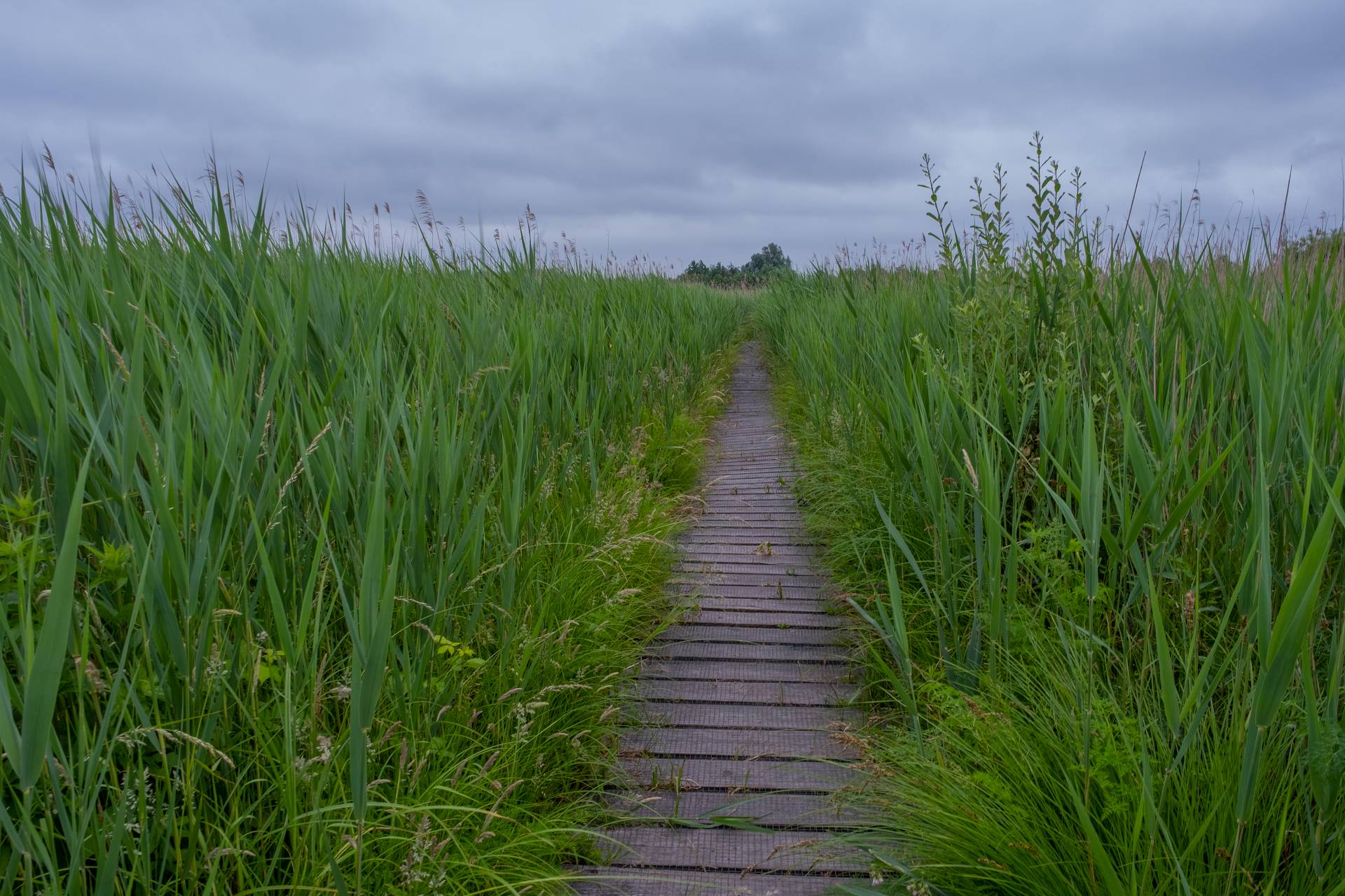 Als je klaar bent met fotograferen van de Vlietmolen keer je weer terug naar de Zederikkade. Net na de oude molen loop je via een loopplank rechts over een sloot. Je betreed nu de Polder Achthoven. In tegenstelling tot wat je verwacht van een polder, loop je hier door een gevarieerd nat landschap. Weilanden en populieren bossen wisselen elkaar af. Delen zijn zelfs moerassig. Ook het pad zelf is een avontuur op zich. Het is onverhard, dan weer wat breder en dan weer smaller. Het loopt voortdurend langs sloten en zelfs af en toe eroverheen. Op verschillende delen van het pad loop je tussen de wilgen door. Kortom, een avontuurlijk pad!