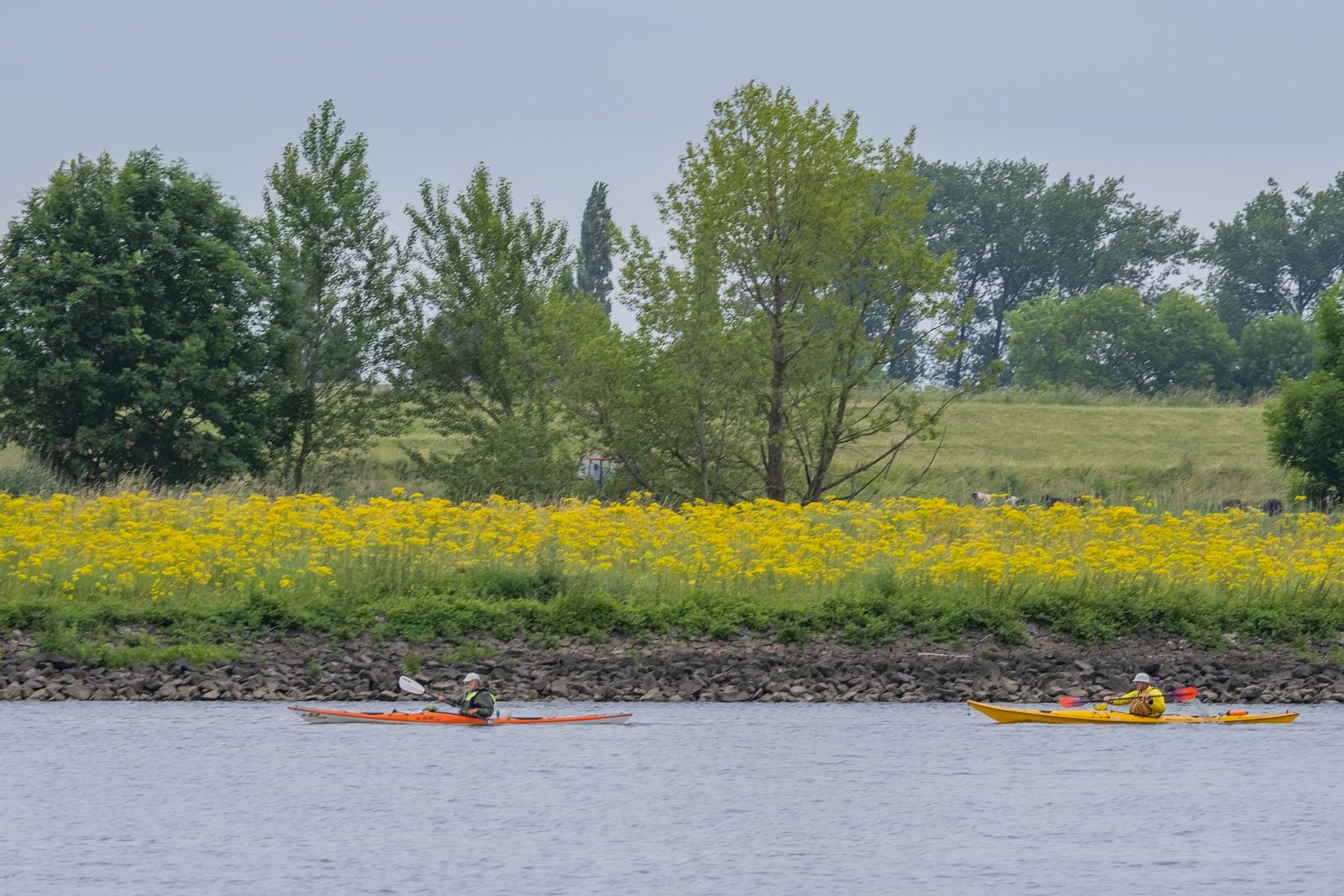 Bij de ini-mini camping vinden wij na enig zoeken een doorgang door de omheining. Wij lopen nu door de Achthovense Uiterwaarden via een nauwelijks zichtbaar pad. Het zicht van het pad wordt grotendeels belemmerd door manshoge brandnetels en bramenstruiken. Een niet heel fijn pad om te lopen in het voorjaar en al zeker niet met een korte broek aan. Hoe dan ook; wij hebben nu eenmaal voor deze route gekozen. Uit de overstapjes en klaphekjes tussen de verschillende percelen maken wij op dat dit een ‘officieel’ pad is. Ondanks de brandnetels en de bramen is het wel weer een avontuur. Met enige opluchting bereiken wij het laatste stuk van de uiterwaarden en dit maal zonder struiken en andere obstakels. Nu is het overduidelijk dat wij over een dijkje wandelen. De omliggende natuur is prachtig. Aan onze linkerhand kijken wij uit op het natte deel van de uiterwaarden en rechts kijken wij uit over de Lek. Aan de overkant is de kerktoren van Jaarsveld te zien en in de verte ligt Ameide.
