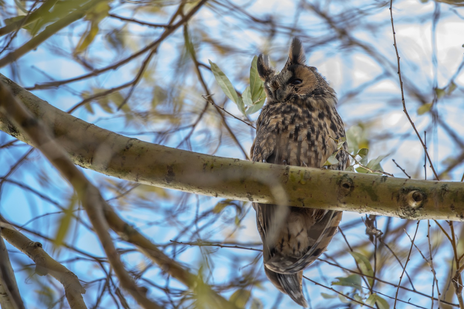 De ransuilen roesten niet allemaal tegelijkertijd. Sommige exemplaren hebben de ogen wagenwijd open en lijken erg geïnteresseerd te zijn in wat jij onder diens boom uitvoert. In feite houdt deze enkeling de wacht voor de anderen. Dat is een van de redenen waardoor de ransuilen overdag in grote(ere) groepen bij elkaar in een boom zitten. Als zo’n flinke uil je aankijkt voelt dit best een beetje intimiderend. Met zijn enorme ronde rood oranje gekleurde ogen kijkt het je behoorlijk indringend aan.