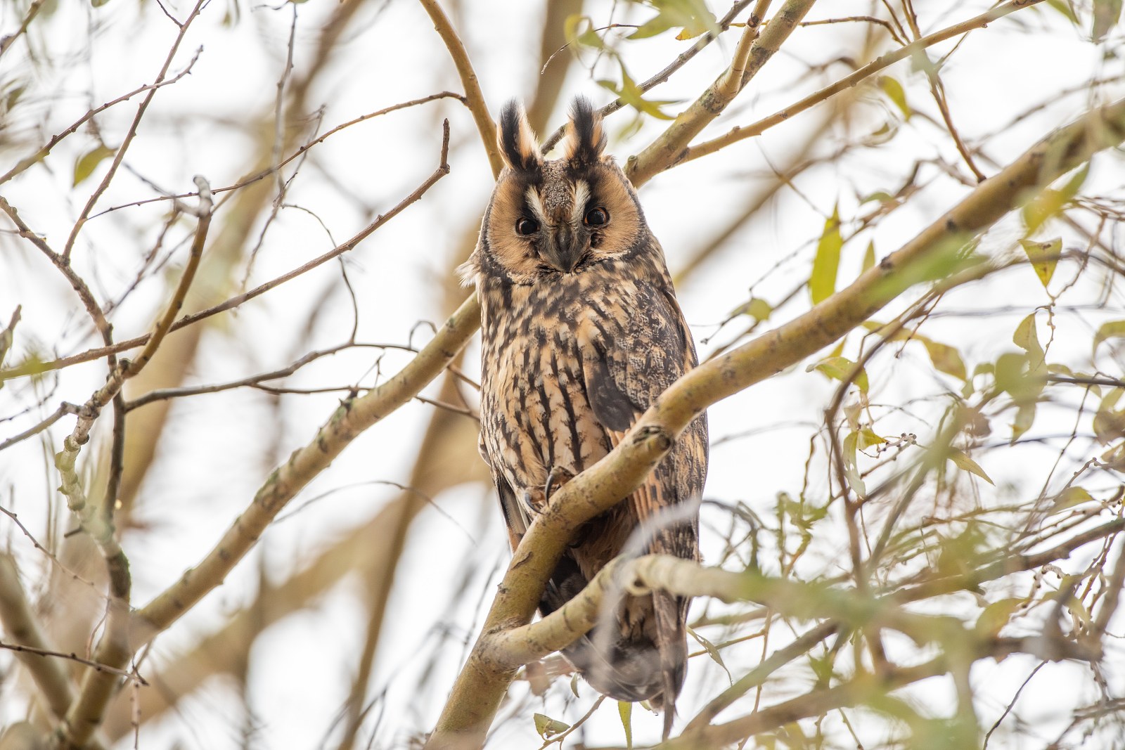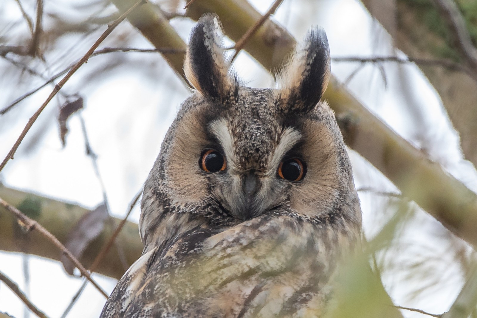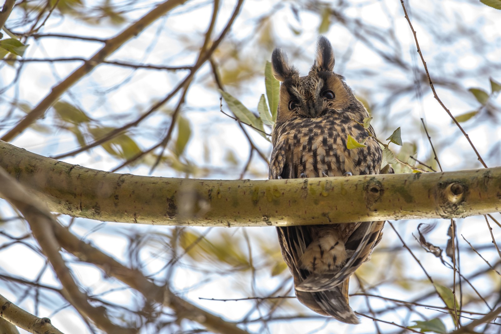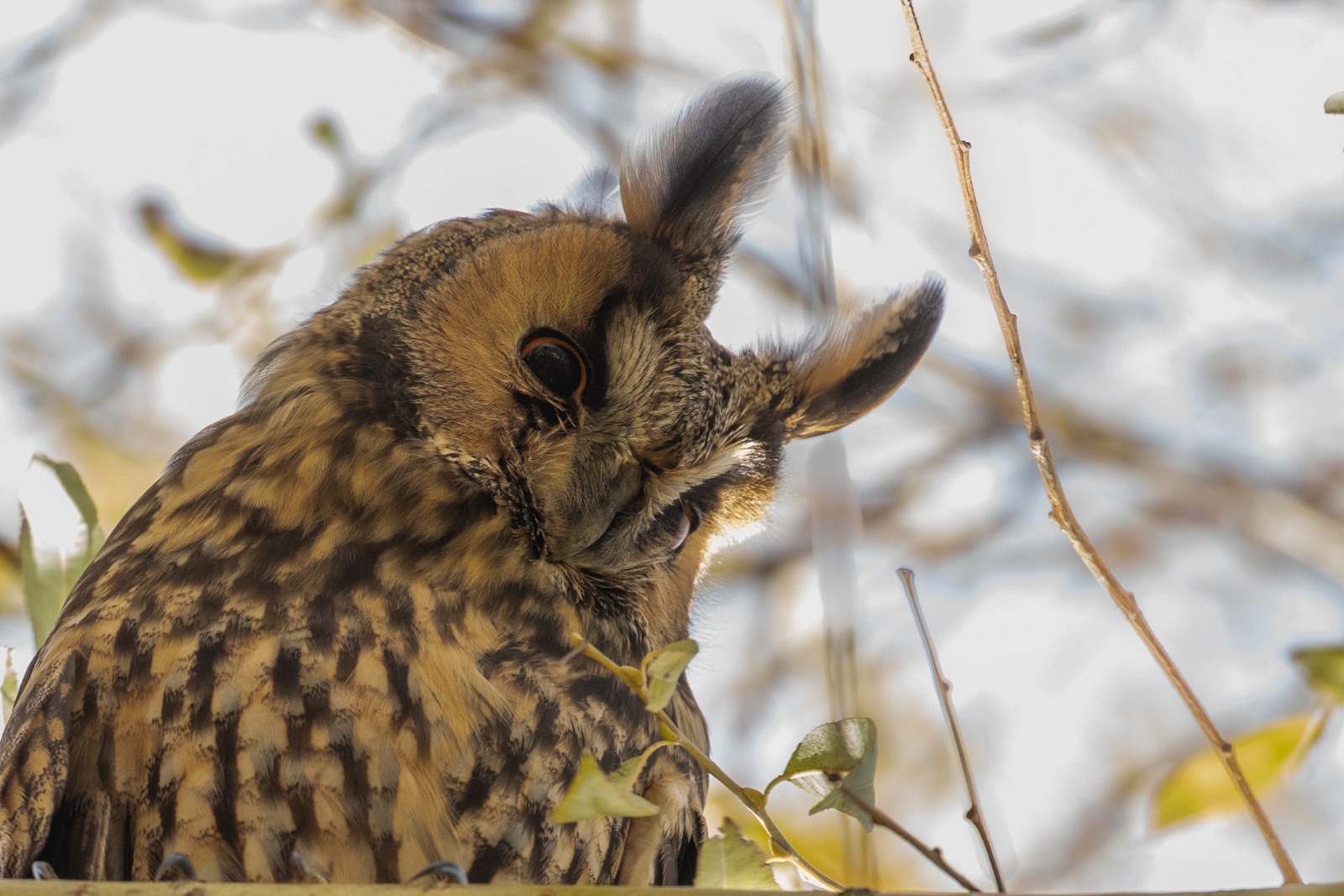 Het fotograferen van de ransuilen is en blijft lastig. Ten eerste zoeken zij, logischerwijs, een boom op waarin zij achter takken en de nog aanwezige bladeren kunnen verschuilen. Een foto maken van een uil zonder dat er een tak(je) in de weg zit is nagenoeg onmogelijk. De volgende werkwijze heeft, zo is mijn ervaring, een redelijke kans van slagen. Ga als dit mogelijk is, nagenoeg recht onder de vogel staan. Schuif dan, kijkend door de zoeker, net zolang heen en weer totdat je in ieder geval de kop van de uil vrij van takjes hebt. Vooral als je via een telelens (is aan te bevelen) fotografeert, zullen je zoekbewegingen slechts uit enkele millimeters bestaan. Heb je dat voor elkaar, dan is het zaak om niet getroffen te worden door de ontlasting van de uil recht boven je! Of, je wilt dat op de ko(o)p toe nemen….