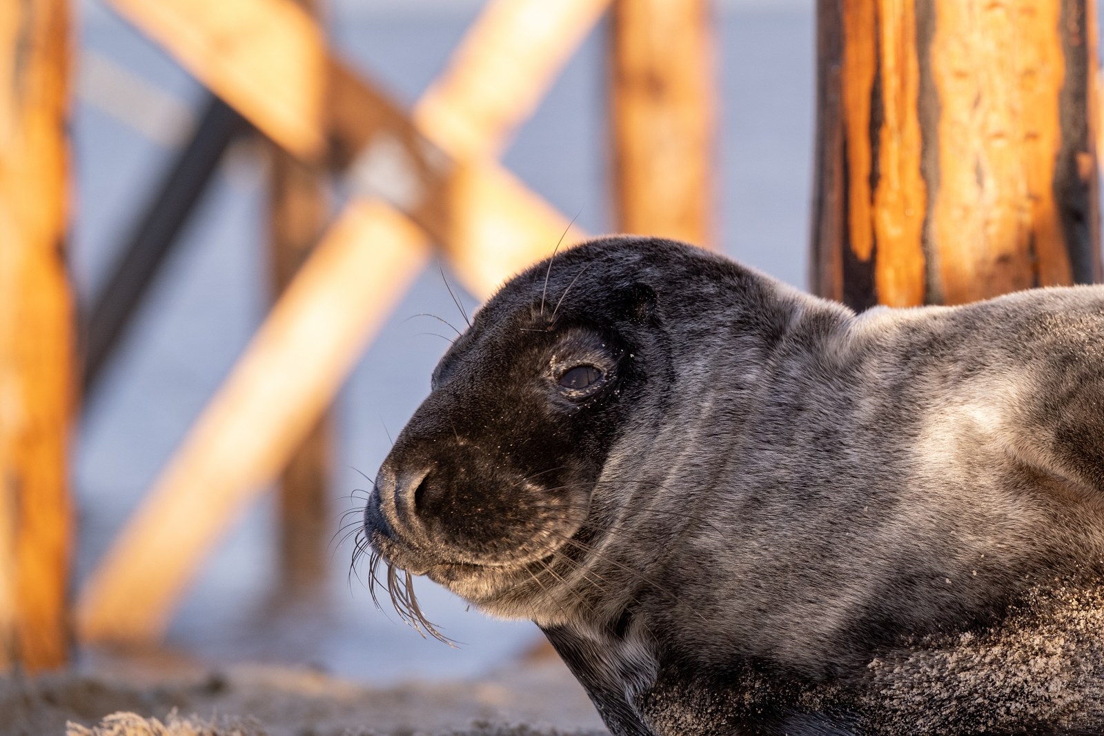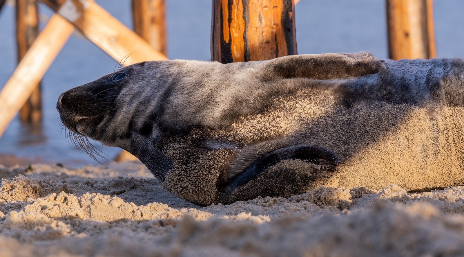 Wandelend op het strand van Texel richting de aanlegsteiger van het (zomer)veer Texel – Vlieland zag ik iets onder de palen van de steiger liggen. Even dacht ik aan een boomstam. Dichterbij gekomen zag ik dat het een grijze zeehond was. De grijze zeehond wordt in de winter veelal op een zandbank of op het strand geboren. De jongen kunnen dan nog niet direct zwemmen en worden op het strand gevoed. Zo kan het dus gebeuren dat je een jonge zeehond op het strand ziet liggen. Veel mensen denken dan dat er iets mis is met het dier. Tenslotte horen zij niet op het strand, althans zo wordt dan gedacht. Niet zelden wordt dan Ecomare gebeld, die daarvoor begrip heeft.