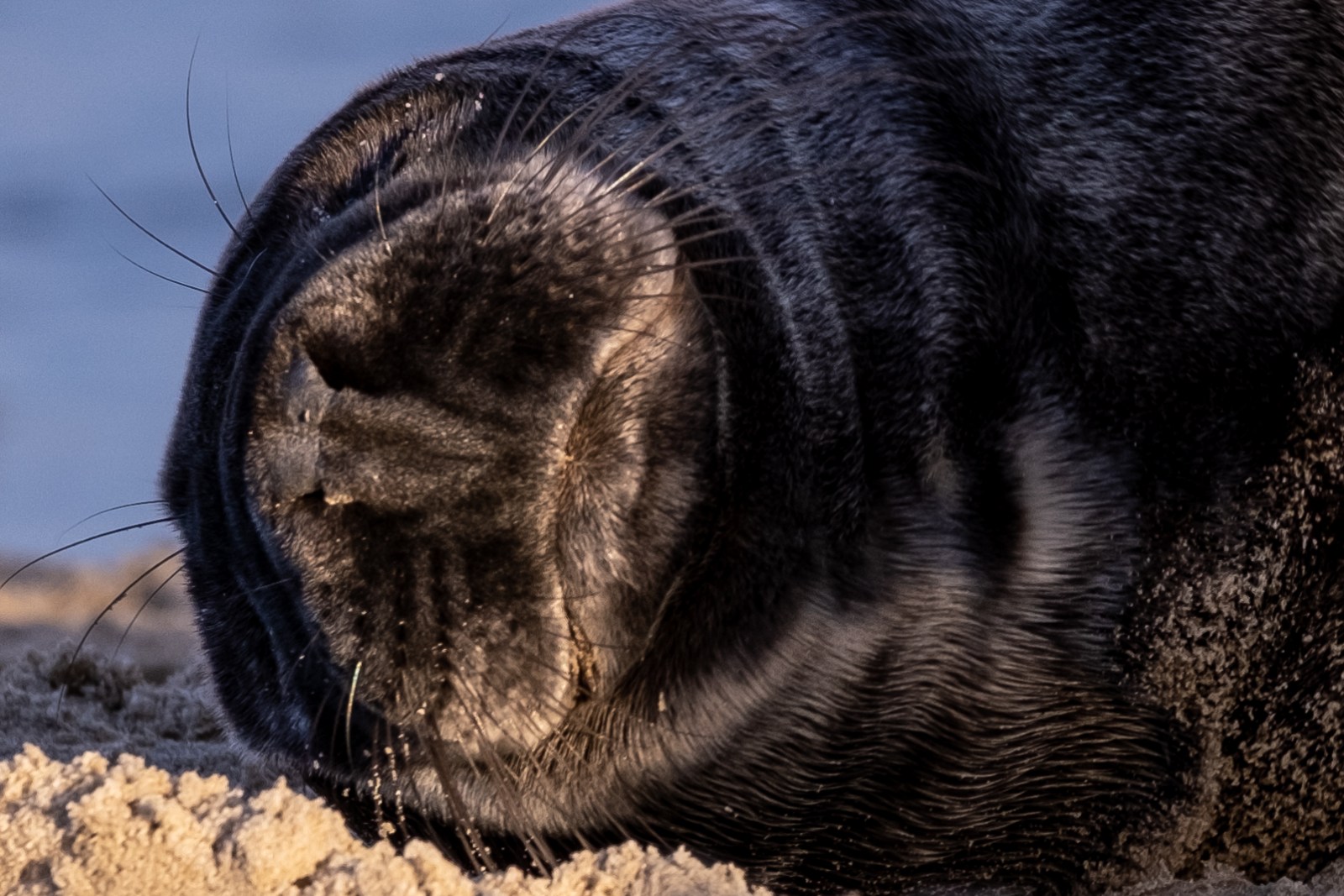 Pas wanneer het voor de medewerkers van Ecomare duidelijk is dat het gevonden jong iets mankeert wordt het opgehaald. Gelukkig kan men de vinder heel vaak gerust stellen en tegelijkertijd duidelijk maken hoe te handelen. Zonder dat ik die bewuste regels kende ben ik op ruime afstand gebleven van de zeehond. Aan de dikke vacht was te zien dat dit dier, weliswaar al van flink formaat, nog een jong was. De haren waren nat dus was het in het water geweest en kon al zwemmen. Snel maakte ik op gepaste afstand met mijn camera en telelens wat foto’s. Niet ver van het strand kwam met regelmaat de kop van een volwassen grijze zeehond boven water. Vast mama of papa die het jong in de gaten hield. Zo kreeg ik dus onverwacht een mooie gelegenheid om een grijze zeehond van dichtbij te mogen aanschouwen. Met recht een close encounter, maar …… not to close!