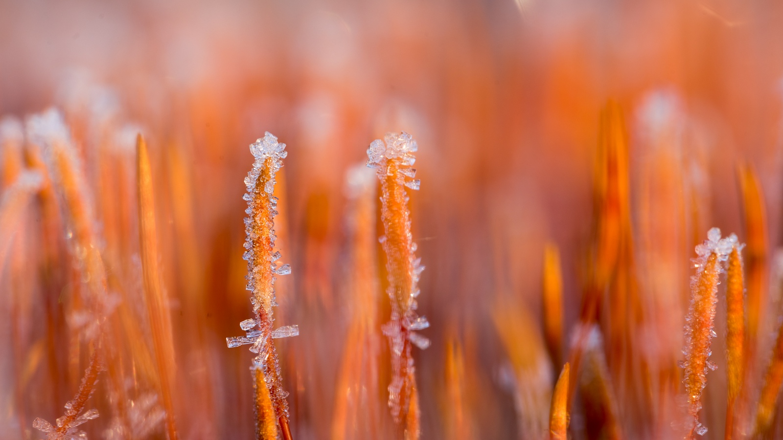 Net als het witte ijshaar…🔍 is het oranje rode ruig haarmos in de winter een fraai en dankbaar foto onderwerp. Het ruig haarmos vinden is op zich niet zo moeilijk. Op open stuifzand plekken, zoals op heidegebieden, verraden in het voorjaar oranje rood gekleurde plakkaten de aanwezigheid van het haarmos. In de winter kan het lastiger zijn om het minuscule plantje te vinden. Het zandhaarmos is namelijk een slanke verschijning van nauwelijks een centimeter groot. Vooral wanneer het is omgeven door rijp of sneeuw kijk je er, ondanks de opvallende kleur, al snel over heen.