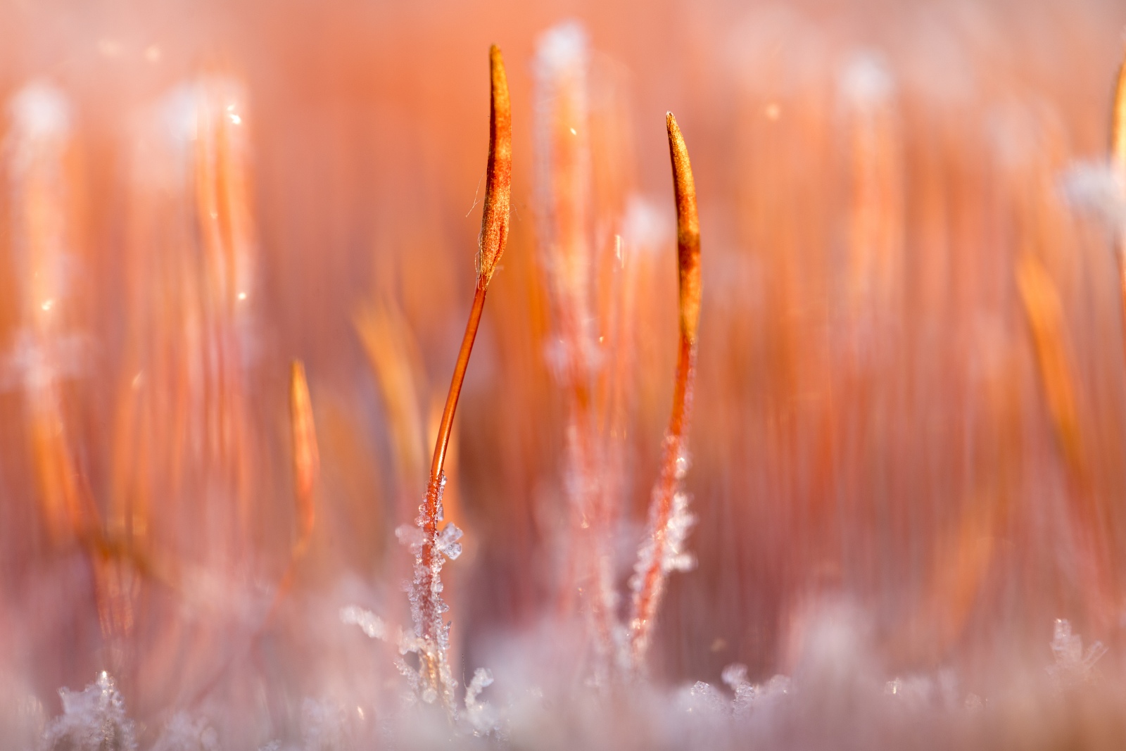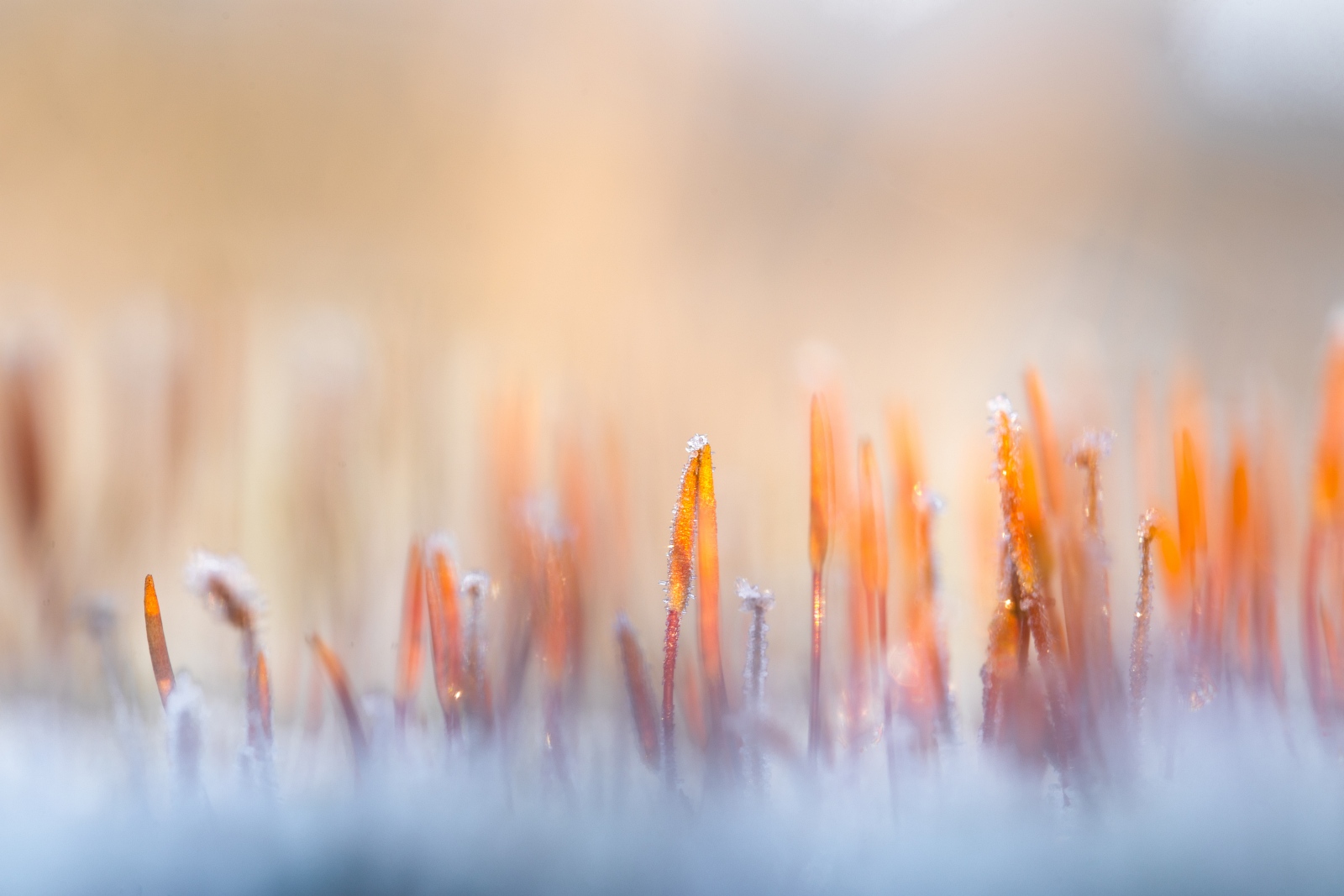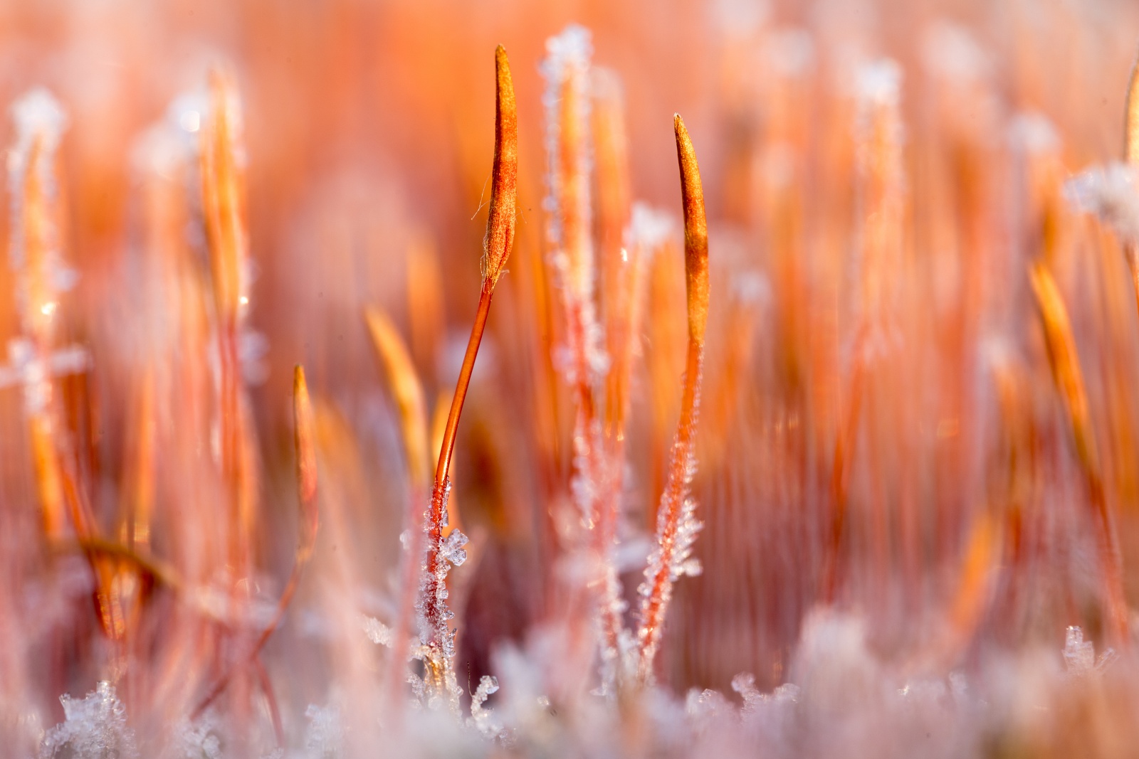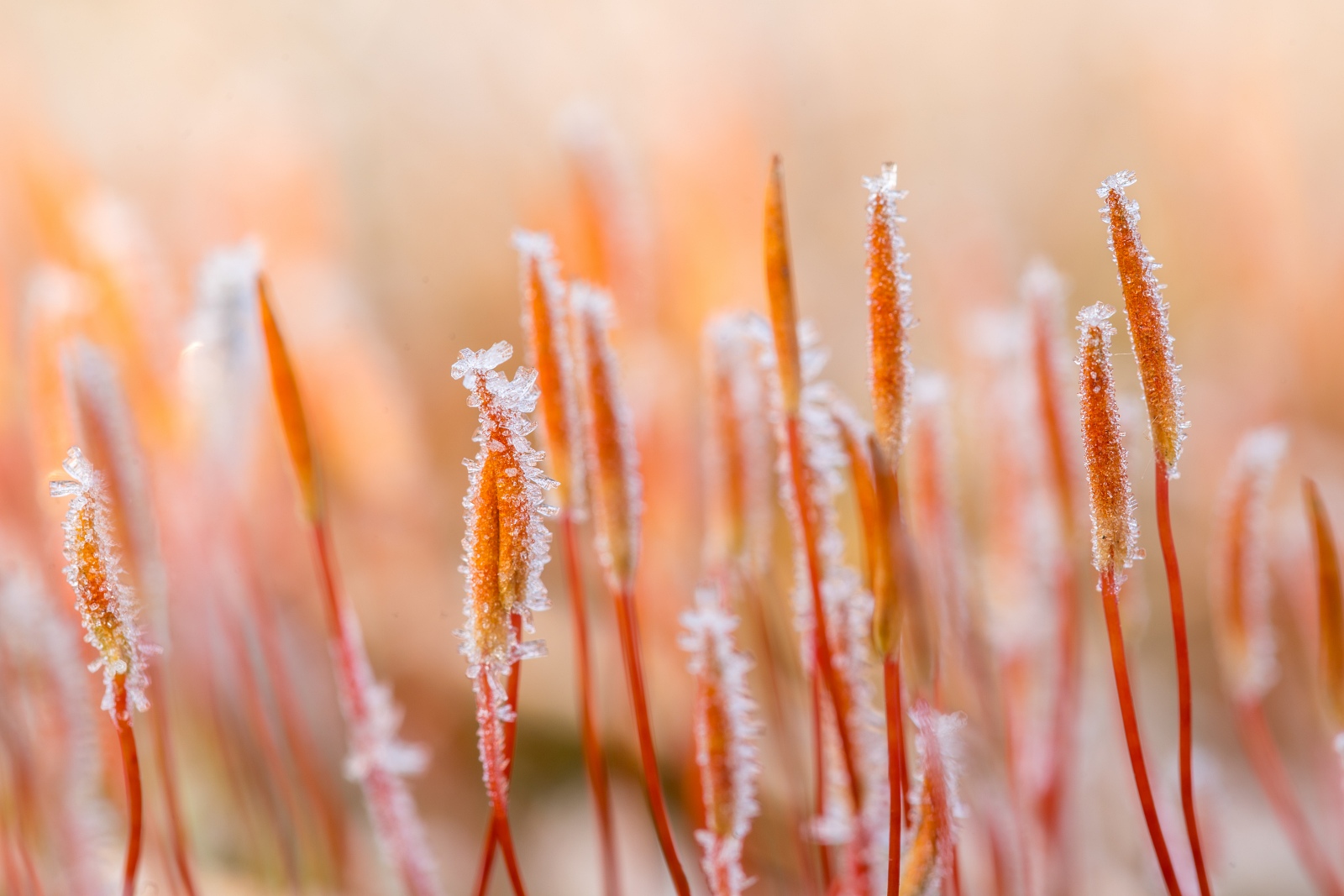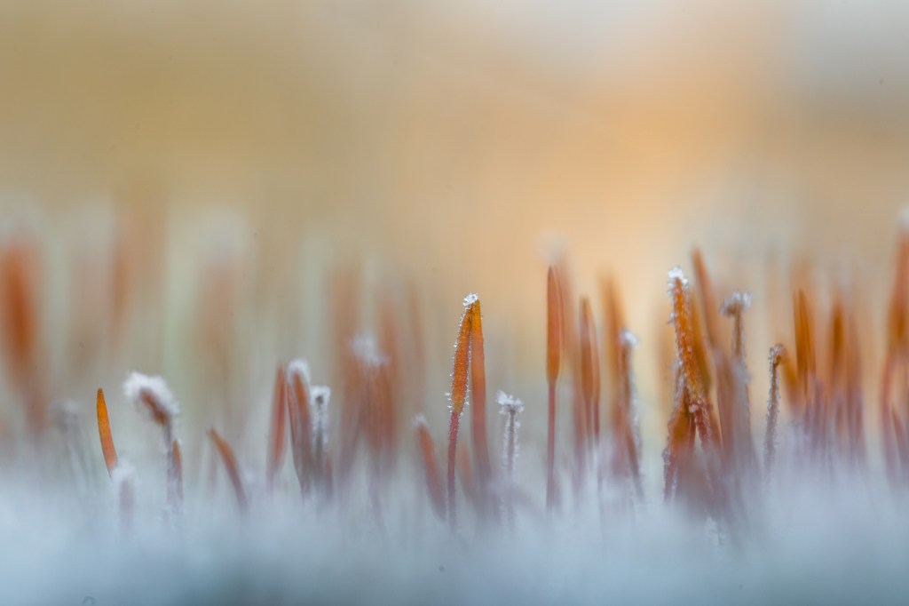 Het ruig haarmos is in de winter, onder de juiste omstandigheden, erg fotogeniek. Een hoge luchtvochtigheid en vorst zijn dè ingrediënten voor het ontstaan van rijp. Minuscule ijskristallen verschijnen op het oranje gele mutsje van het ruig haarmos. Het gebruik van een camera met macrolens is hierbij aan te bevelen. Heb je geen macrolens, maar wel een macrostand op je camera, dan is dat ook prima. Persoonlijk houd ik er van om mijn onderwerp(en) op ooghoogte te fotograferen. In dit geval ligt de camera op de grond. Om de camera te beschermen tegen vuil, of in dit geval ook rijp, ligt mijn camera op een plastic zak. Omdat het haarmos in flinke aantallen bij elkaar staat geeft dit door de lens vaak een onrustig beeld. Daarom zoek ik, kijkend door de lens, naar een mij aansprekende compositie. Tot slot kies ik een diafragma getal dat een kleine scherptediepte oplevert. Hierdoor worden slechts enkele exemplaren scherp in beeld gebracht en vervaagt de rest.