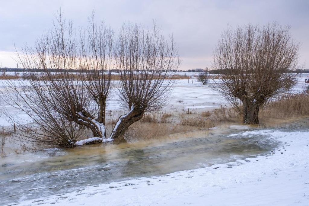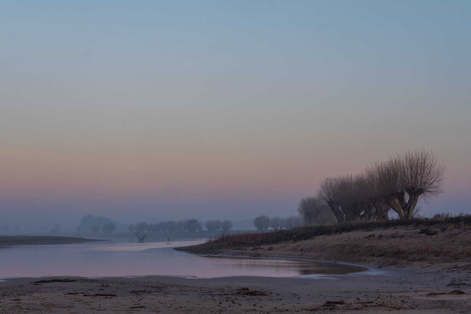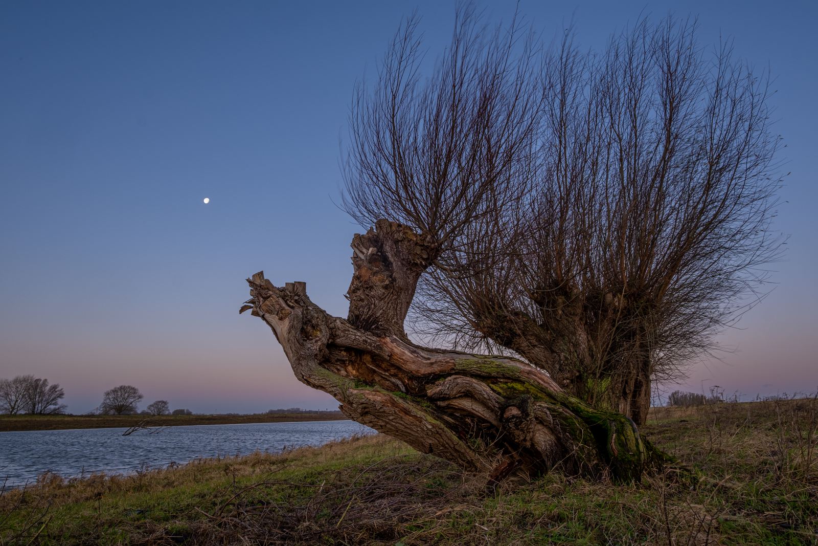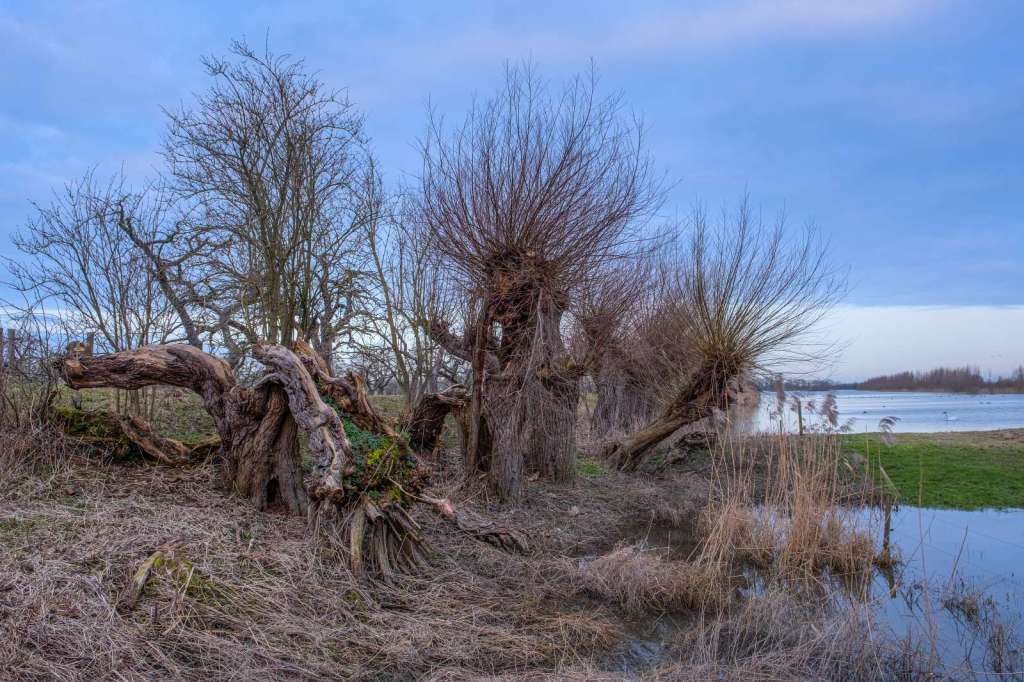 De Heesseltsche Uiterwaarden langs de Waal tussen de plaatsen Opijnen en Heesselt. Dit zogenaamde overloopgebied van de Waal is het resultaat van de herinrichting dat plaats vond tussen 2016 en 2019. Het resultaat is een mooi, divers, spannend en uitgebreid natuur- en struingebied. Bij de herinrichting van de uiterwaarden heeft men bewust de oude knotwilgen gespaard. Zij staan op een geweldig mooie plek direct langs de oever van de nevengeul. Keurig in een rij en waarschijnlijk al vele jarenlang. De wilgen hebben allemaal de kenmerkende grillige vorm en dat maakt hen bijzonder fotogeniek. Eindeloos lang kun je er op allerlei manieren de wilgen fotograferen. Op windstille dagen laten zij zich fraai weerspiegelen in het water van de nevengeul. Bovendien sta je dan iets lager als de bomen. Hierdoor is de achtergrond nagenoeg vrij en komen de knotwilgen volledig en prachtig tot hun recht.