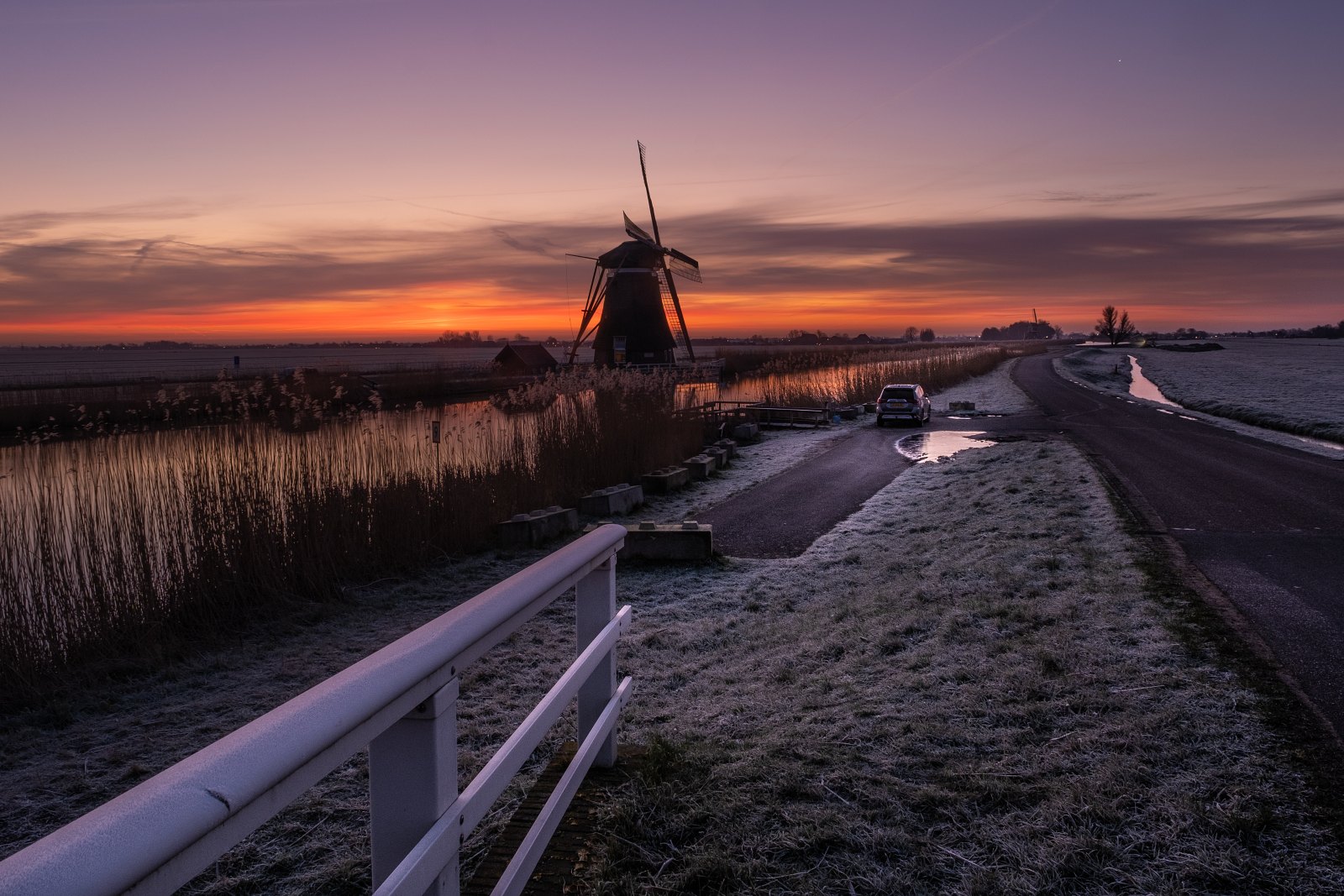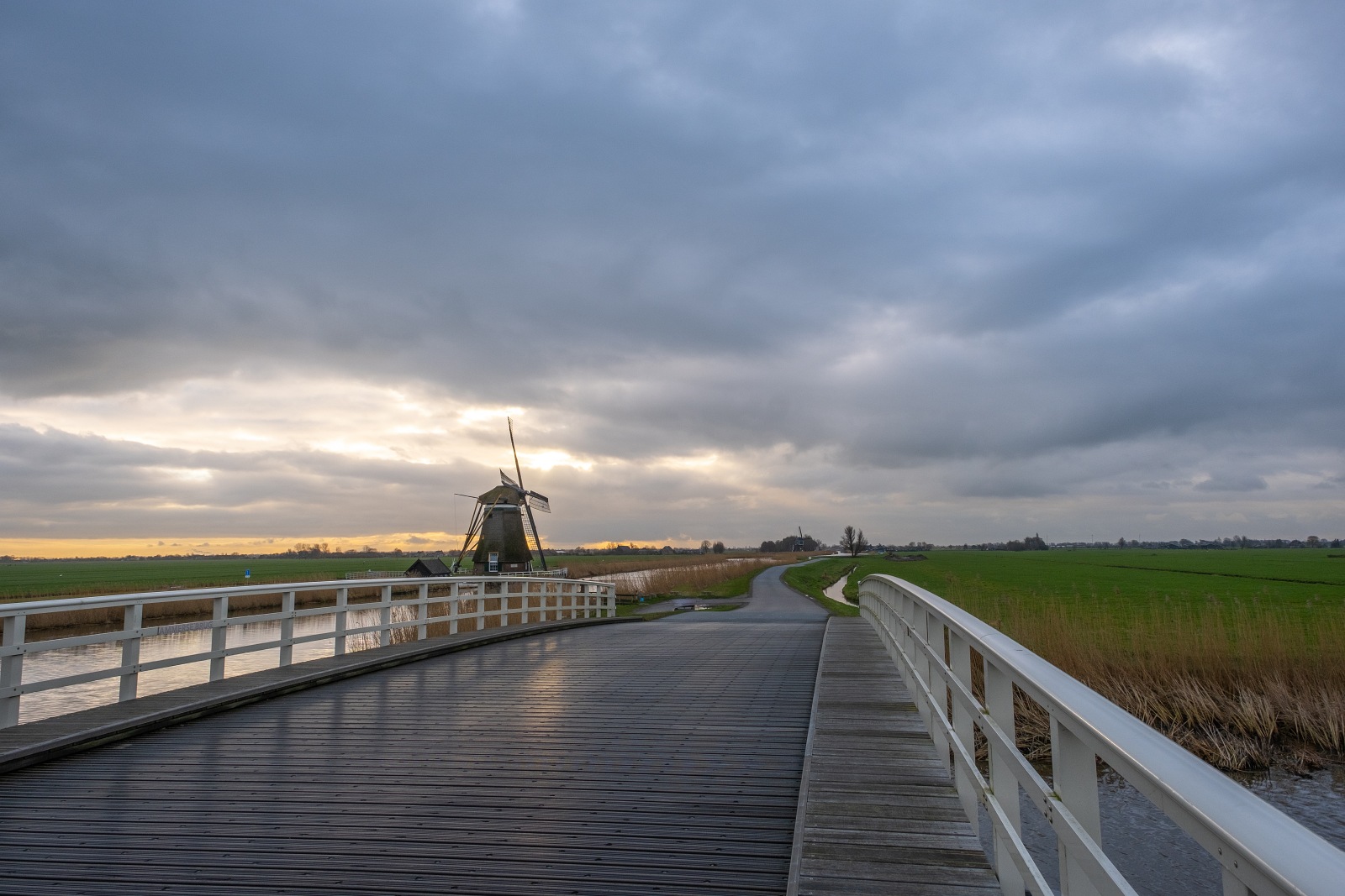 Vanaf de brug heb je ook zicht op de molen. Doordat je hier wat hoger staat krijg je een wat ruimer overzicht van het landschap waarin de molen staat. Nadeel is wel wanneer er een auto geparkeerd staat bij de steiger, dat deze zichtbaar is op je foto. Je hebt op de brug daarentegen wel de mogelijkheid om gebruik te maken van de diverse zichtlijnen in je compositie. Houdt op de brug wel rekening met het verkeer dat over de kade en de brug rijdt!