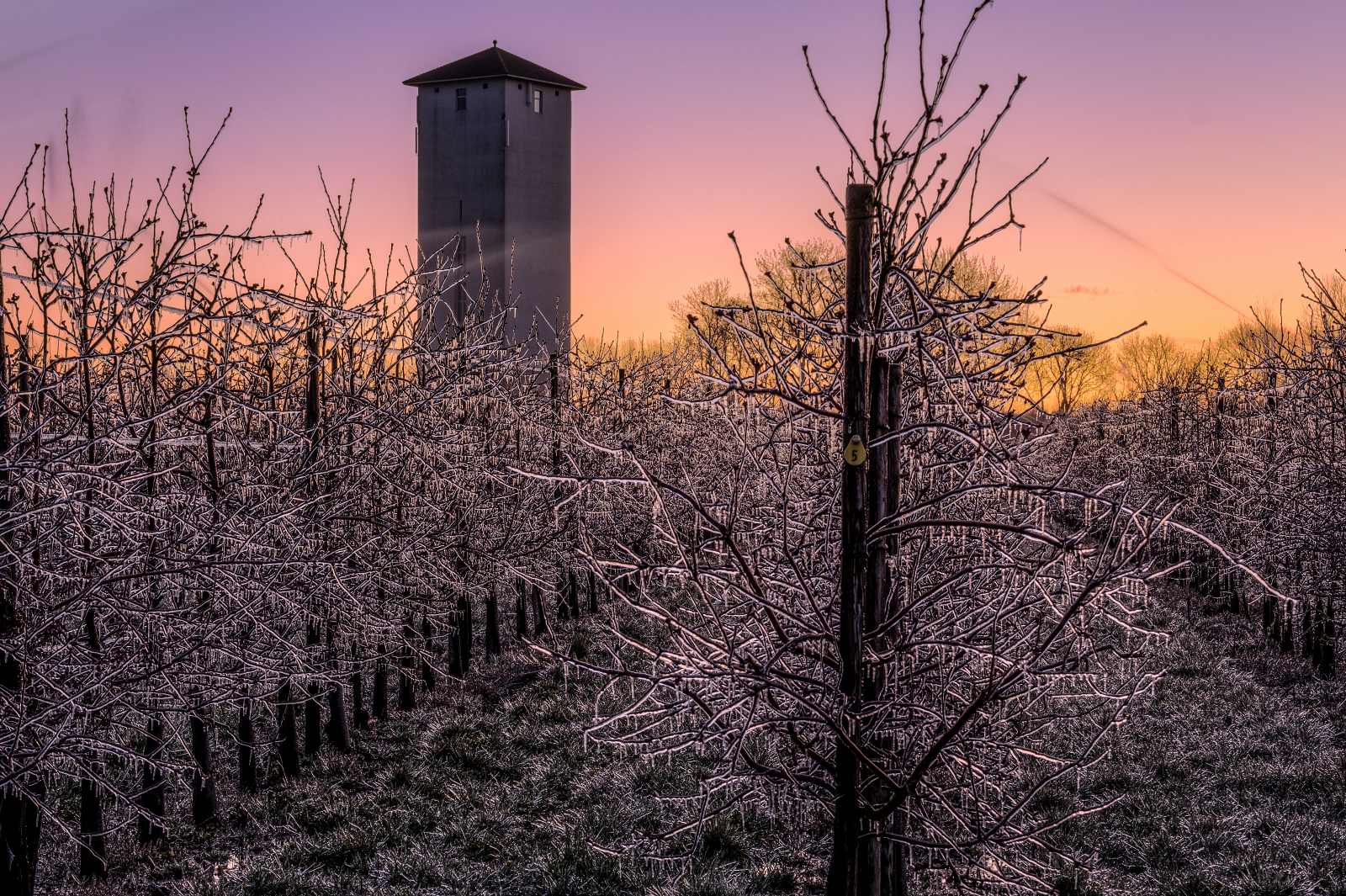 Zo alles heeft ook deze weeromslag zijn keerzijde. Voor de opbloeiende natuur is de nachtvorst een ramp, maar het levert wel fraaie beelden op. Vooral het beregenen van de boomgaarden is goed voor spectaculaire en sprookjesachtige beelden. De afbeeldingen hieronder die ik vorig jaar mocht maken getuigen daarvan.