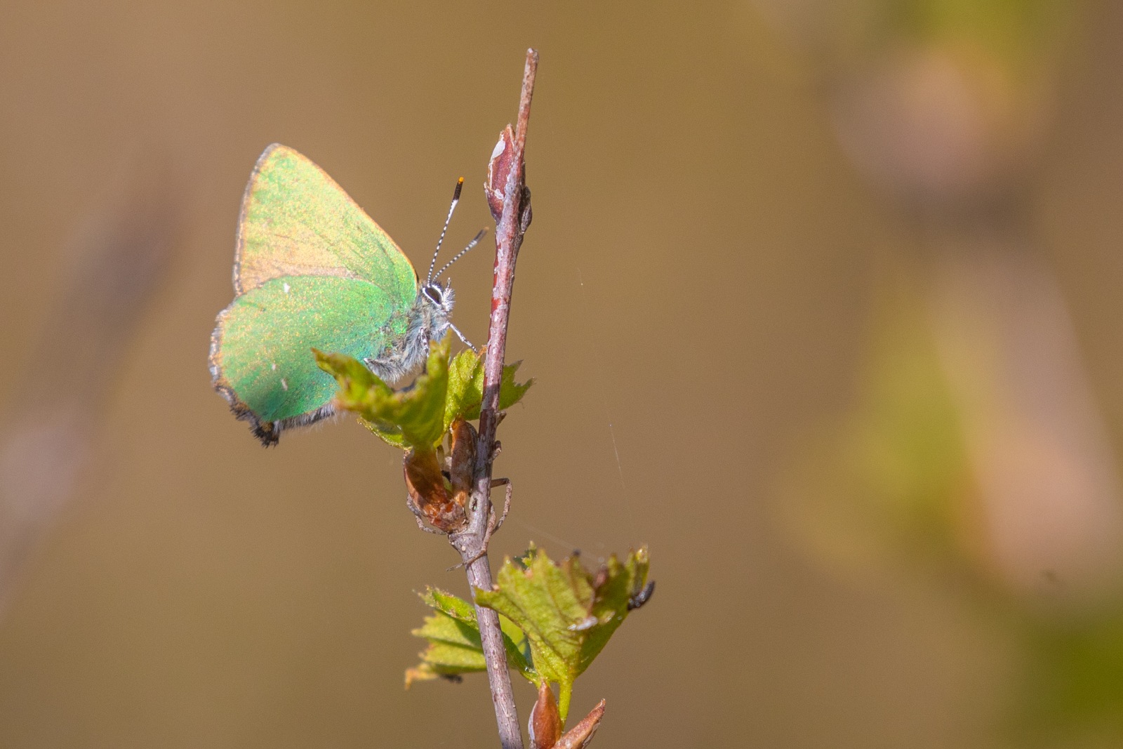Dit vlindertje is pas te vinden als het, in tegenstelling tot diens soortgenoten, aan het fladderen is. Nee, als de temperatuur nog laag is en de insecten inactief, is dit groentje nauwelijks te vinden. Maar ja, hoe krijg je het dan voor elkaar om een zo actief beestje te fotograferen? Welnu, er zit niets anders op dan het te volgen en te hopen dat het ergens gaat zitten. Pas wanneer het groentje even stil zit, moet je toeslaan.