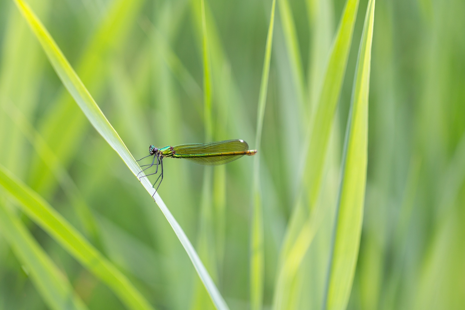 Lastiger wordt het wanneer de weidebeek actief is en van rietblad naar rietblad fladderen. Het fijne van deze juffers is dat zij over het algemeen wel genegen zijn wat langer te blijven zitten. Toch zijn ook zij er niet van gediend als jij een foto probeert te maken met een macrolens of met de macro-instelling van jouw camera. Of te wel; je zult op ruime(re) afstand moeten blijven en is dus ook hier de tele(zoom)lens de lens die uitkomst biedt.
