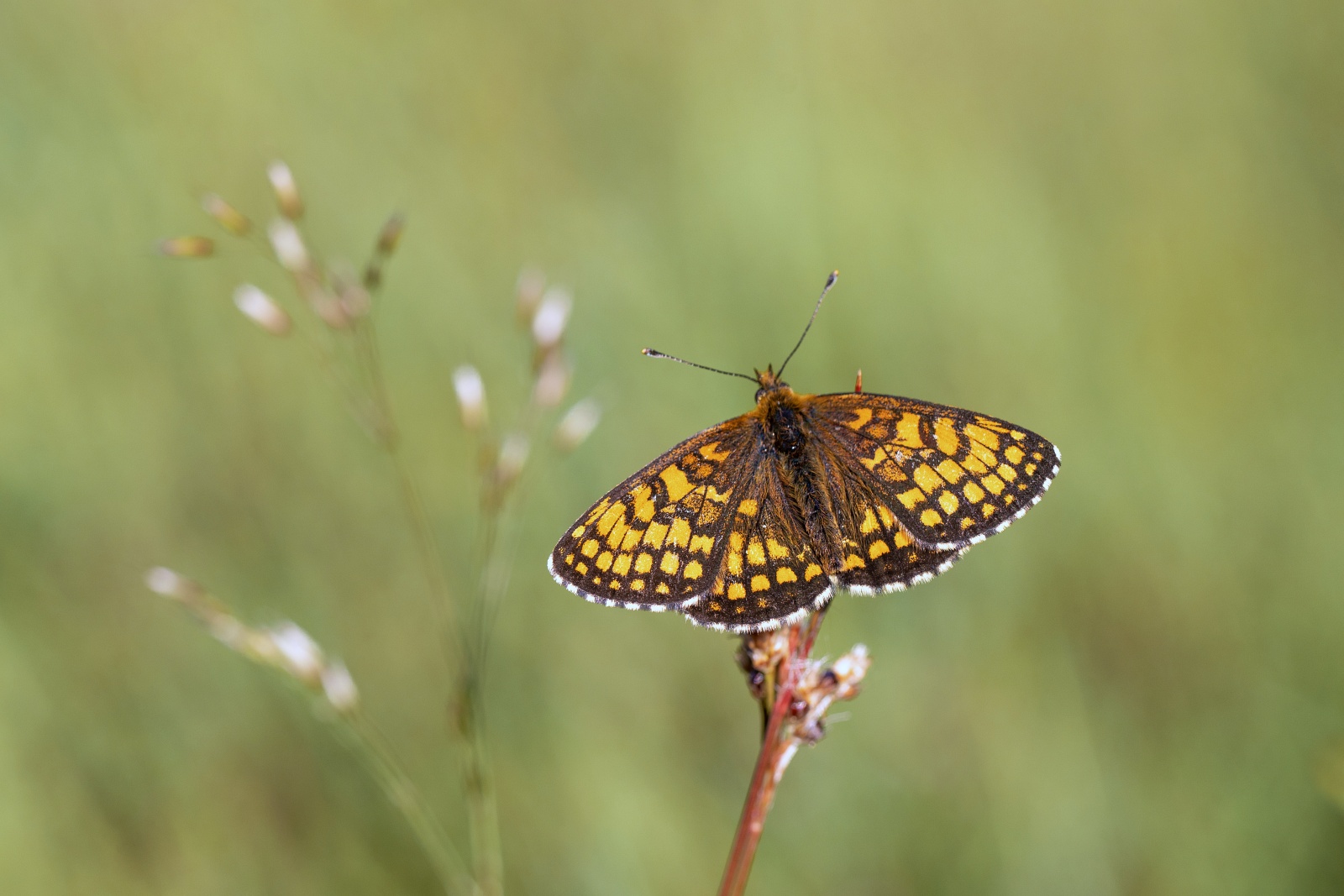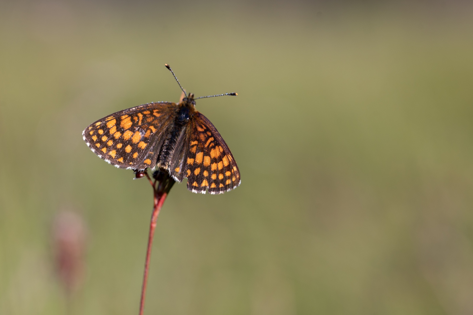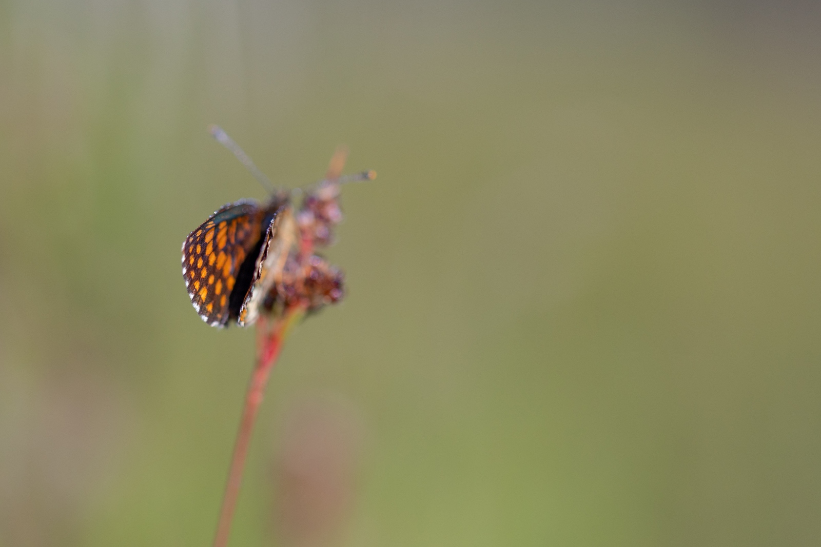 Tot mijn verbazing hoef ik niet lang te zoeken. Op een stengel van een grassoort zie ik een middelgrote oranje-zwart gekleurde vlinder. Als ik dichterbij kom is het inderdaad een bosparelmoervlinder. Door de wind slingert de vlinder heen en weer hetgeen een scherpe foto maken flink bemoeilijkt. Toch zitten er gelukkig enkele scherpe opnames tussen in een serie achterelkaar gemaakte foto’s. Onderaan dit artikel leg ik in het kort uit hoe ik te werk ga bij het maken van macro foto’s wanneer het object heen en weer beweegt door de wind.