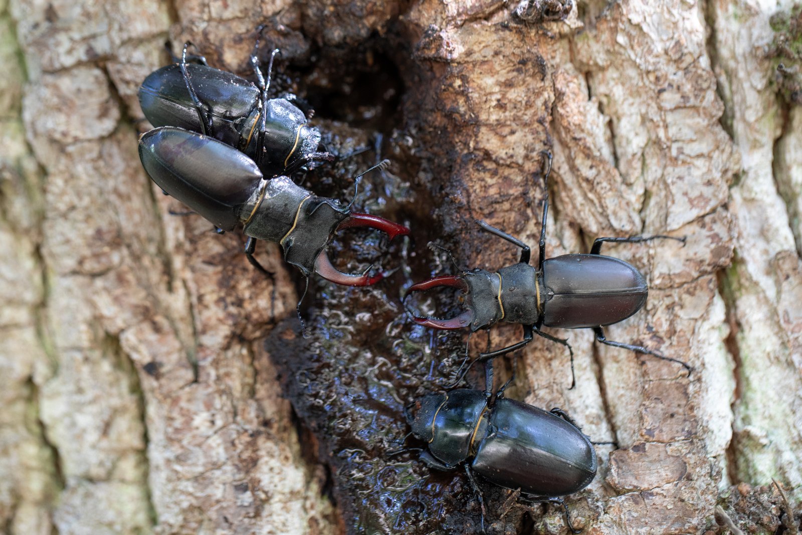 Zo onderwerp ik sinds kort oude eikenbomen die aan de rand van een open vlakte in het bos staan, aan een onderzoek. De locatie van mogelijke kans hebbende eiken leg ik als waypoint vast op mijn Topo GPS app. Langs de rand van de kapvlakte waar ik onlangs de bosparelmoervlinder aantrof, vond ik ook een aantal eiken. En warempel in één van die eiken zag ik niet één Vliegend Hert, maar vier stuks. Twee mannelijke en twee vrouwelijke exemplaren.