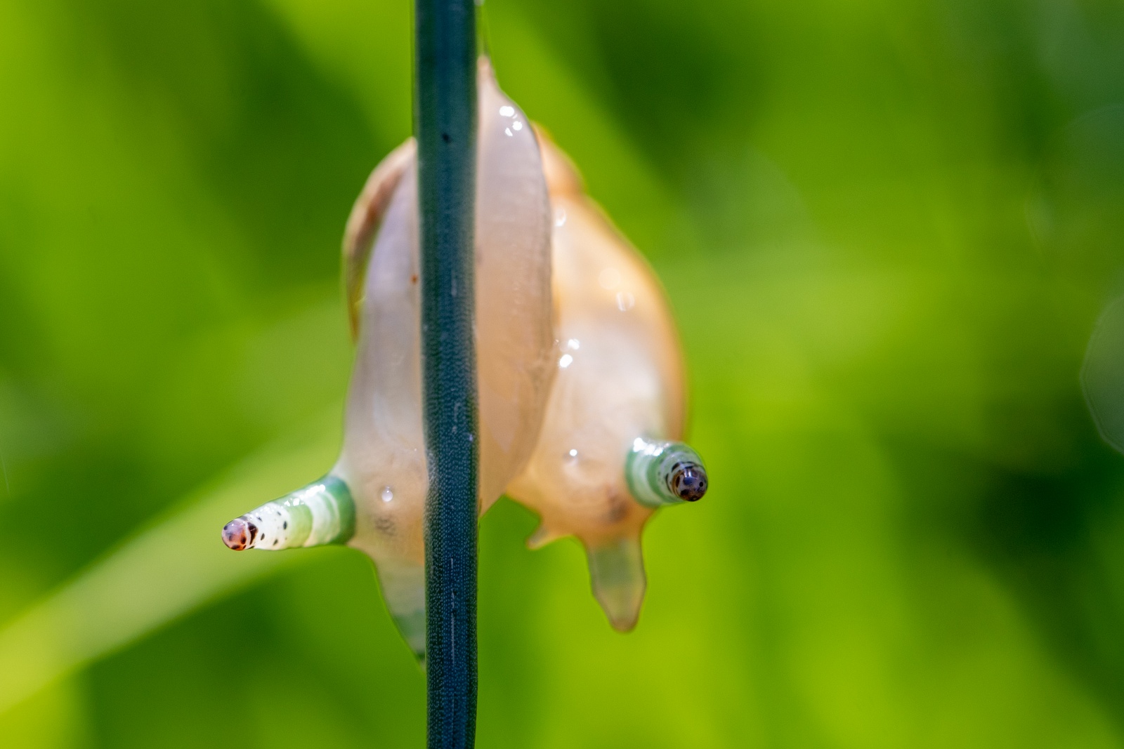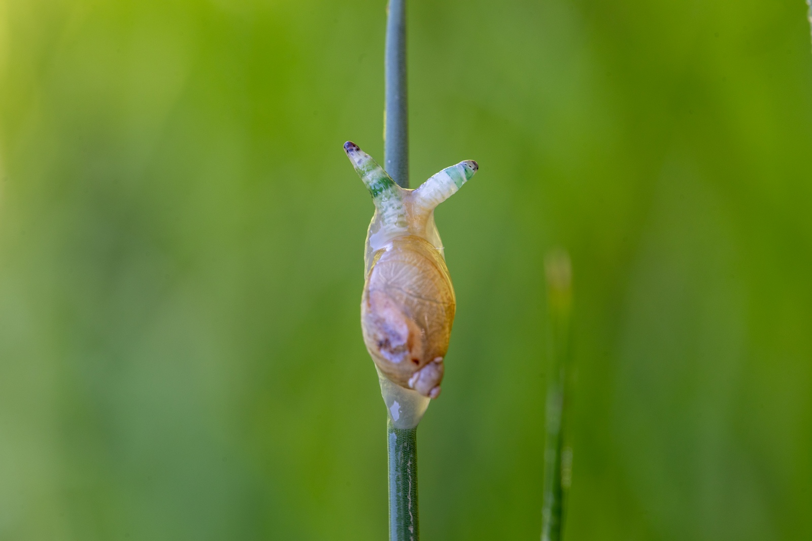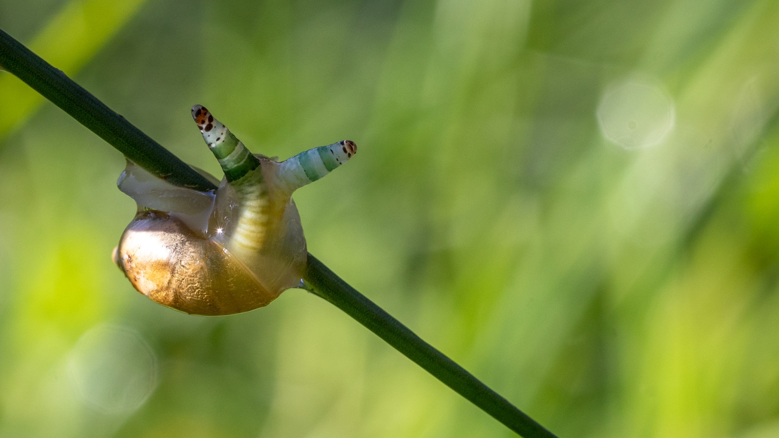 Onlangs trof ik een barnsteenslak aan met wel heel bijzondere ogen. Dikke uitpuilende ogen waarin groene ringen op en neer bewogen, pulseren genaamd. Navraag leerde dat het echter niet de ogen van de slak waren. Nee, in feite keek ik naar de groengestreepte broedzak van een parasiterende platworm luisterend naar de naam Leucochloridium paradoxum. Deze broedzak is in feite het volwassen groeistadium van talloze larven sporcysten genaamd. Een volwassen broedzak dringt een oogstengel of tentakel van de barnsteenslak binnen en verandert zo het uiterlijk ervan.