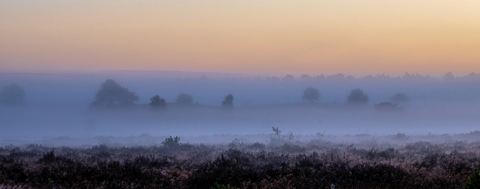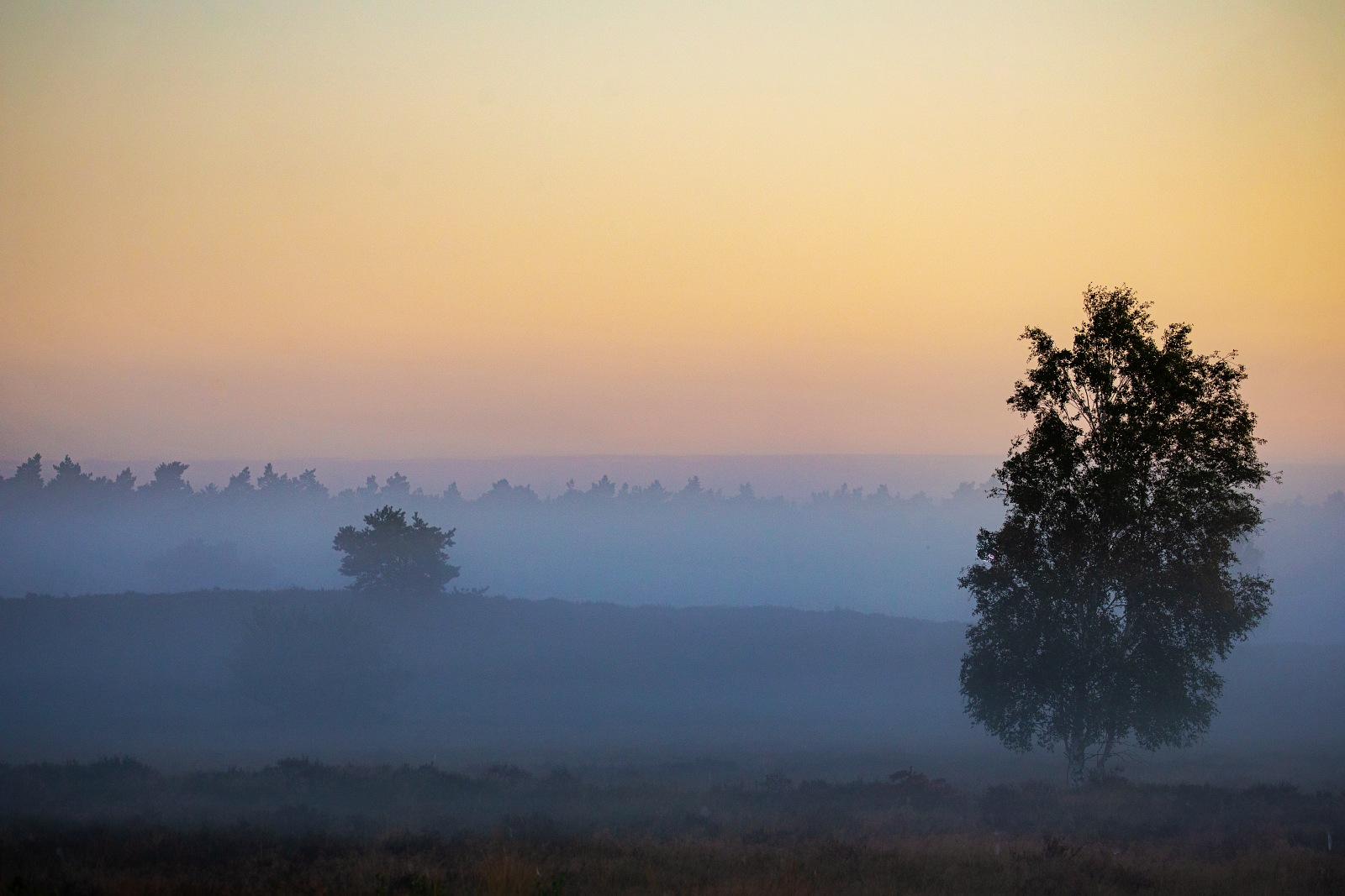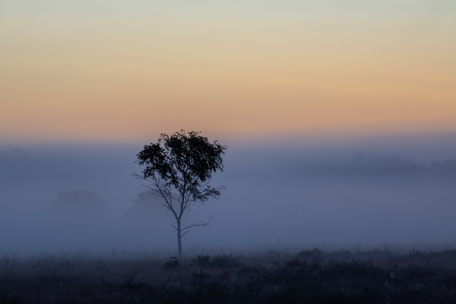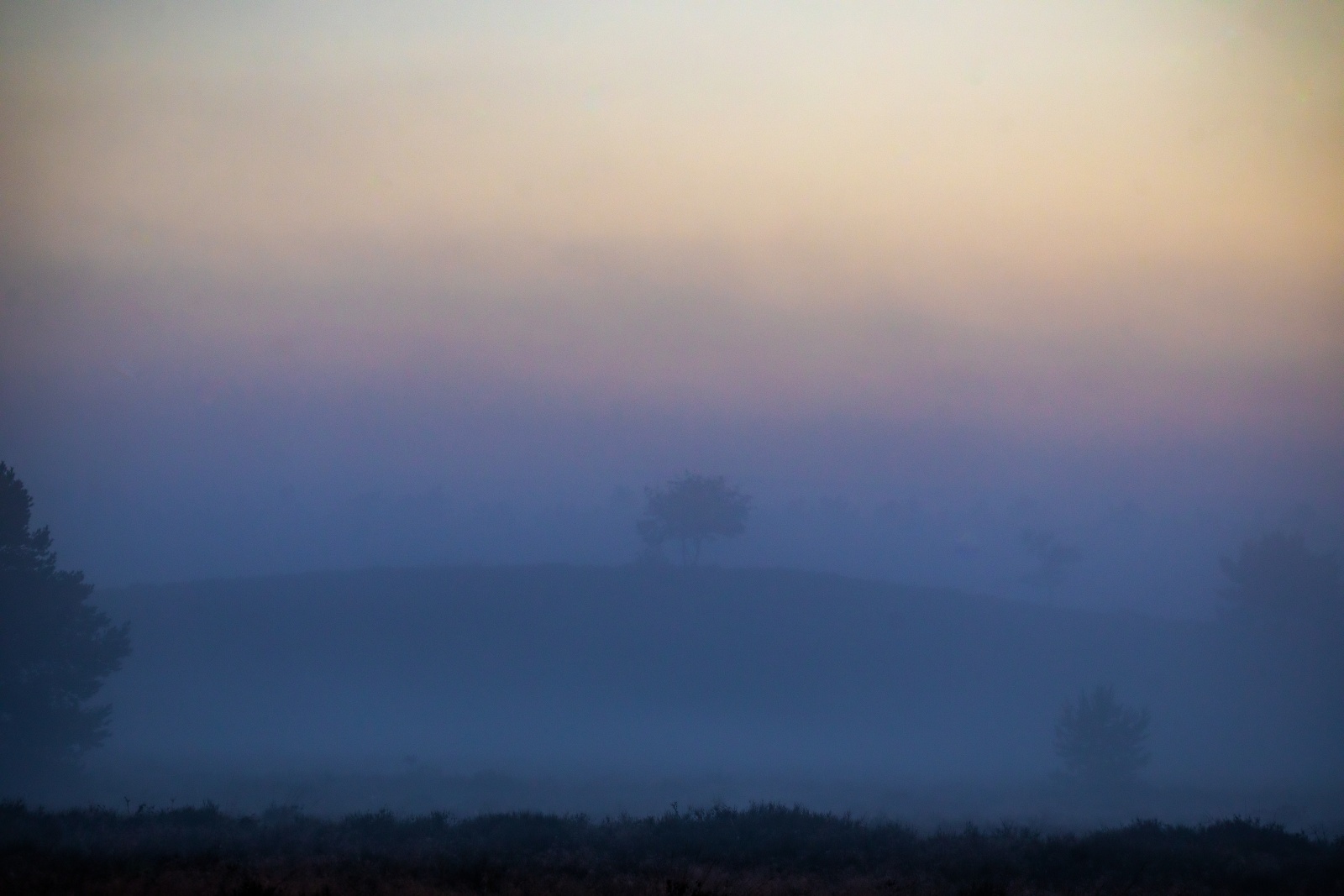 De 16e juli j.l. was zo’n ochtend waar ik mijn hart kon ophalen wat betreft het fotograferen van lagen. Ver hoefde ik daarvoor niet te gaan. Een tien minuten durend ritje op de fiets vanaf het park in Emst en ik sta aan de rand van de Gortelse Heide. Het is wel erg vroeg opstaan om het maximale aan lagen en kleuren eruit te kunnen halen. Lang hoef ik niet te zoeken naar de lagen. Niet alleen de nevel zelf vormt mooie lagen, ook de lichte glooiingen in het heidelandschap zorgen voor lagen. Glooiing door onder andere een oude stuwwal genaamd Gortelse Berg.