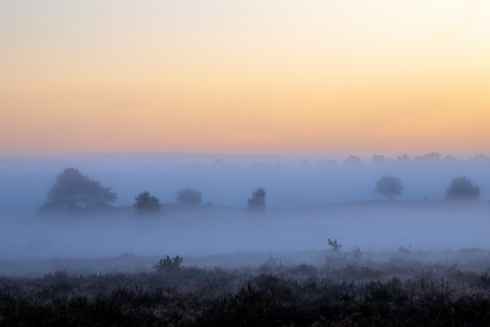 Behalve de mooie nevel laag die over de Gortelse Heide ligt, is ook het kleurenpalet erg fraai deze ochtend. De opkomende zon zorgt hiervoor, die bovendien gunstig opkomt ten opzichte van mijn standpunt. De app van Photo Ephemeris helpt mij, zoals gewoonlijk, vooraf bij het bepalen van de plek waar ik ga staan. Kortom, alles klopt deze ochtend.