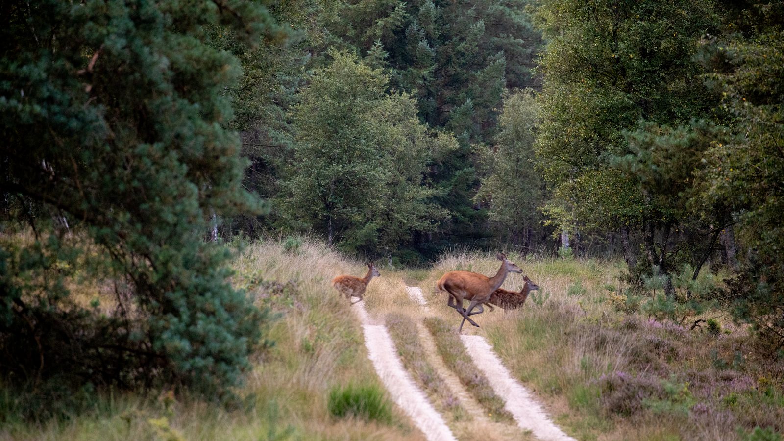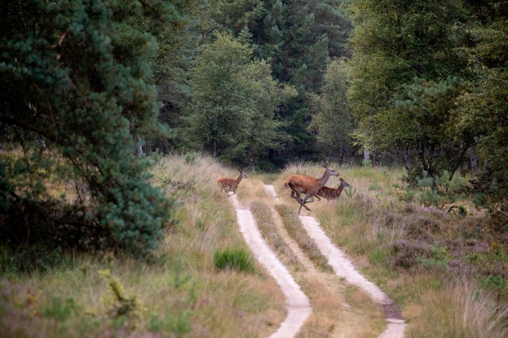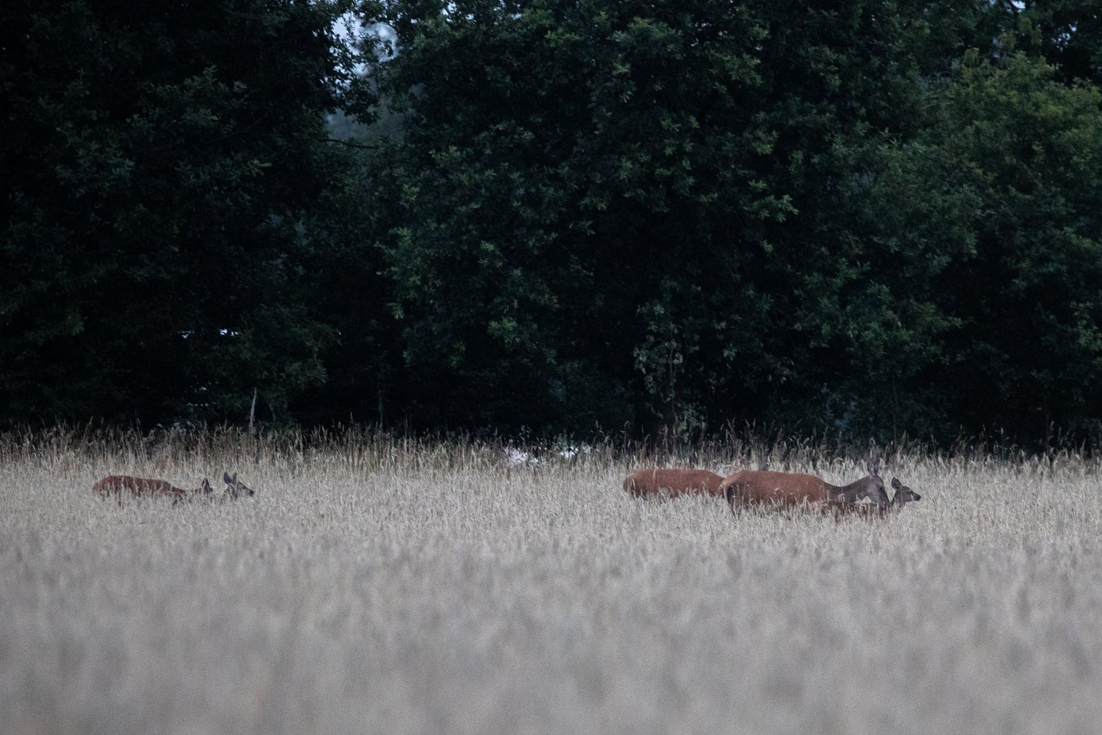 It is August 5 ’22 and at 5.30 am we get on our bikes. Hanging around my shoulder is my Canon camera with the 100×400 mm zoom lens on it. A lens with which I can properly visualize things both at a greater distance and close up. We cycle in the direction of the Gortelse Wood and pass the eponymous heath. Unfortunately there are a lot of clouds and so we don’t have to be there this morning for a spectacular sunrise. Just past the hamlet of Gortel, Jennie sees some hinds with a deer calf. Hardly visible due to the tall grass, the considerable distance and the low light on this early morning. Although there is very little light, I do want to take a photo attempt. I have set my ISO to automatic and see that despite the necessary maximum value of 12,800 ISO (!) I only have 1/25 second to photograph the animals.