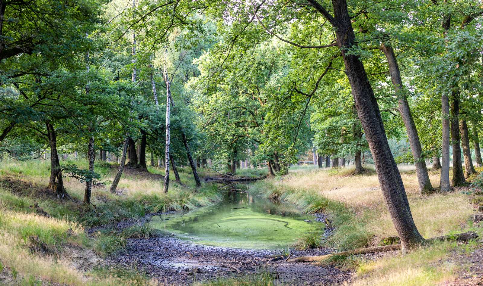 While touring through the Gortelse Wood, Jennie leads us to a drinking pool hidden in the forest. Due to the ongoing drought, the water level in the pool is very low. However, in the mud we see quite a few hoof prints. From this we deduce that this is a nice place to hang our wildlife camera. We take the time to make some recordings of a drying pool. Because I only have the zoom lens with me, it is not possible to take a nice overview photo. That is why I decide to make a panorama photo by hand and the end result did not disappoint me.